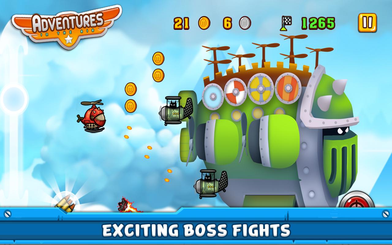 Adventures In the Air is a unique sky adventure, combining a traditional endless running game with an exciting air combat shooting experience. The stunning visual graphics, along with great sound effects and animations, makes it a game you cannot afford to miss.