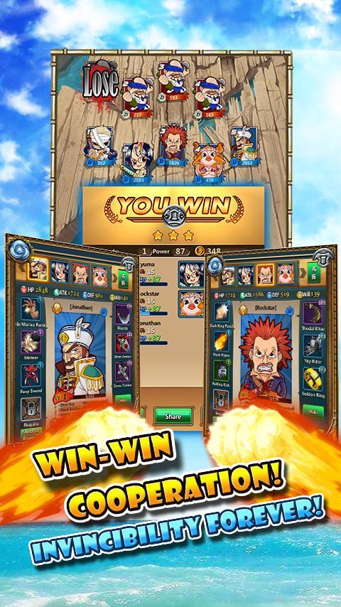 Build a powerful team! Conquer your Sea Empire! Fight with players all over the world to become the pirate king! Come on! Fulfill your dream in ALL BLUE 2 at once!