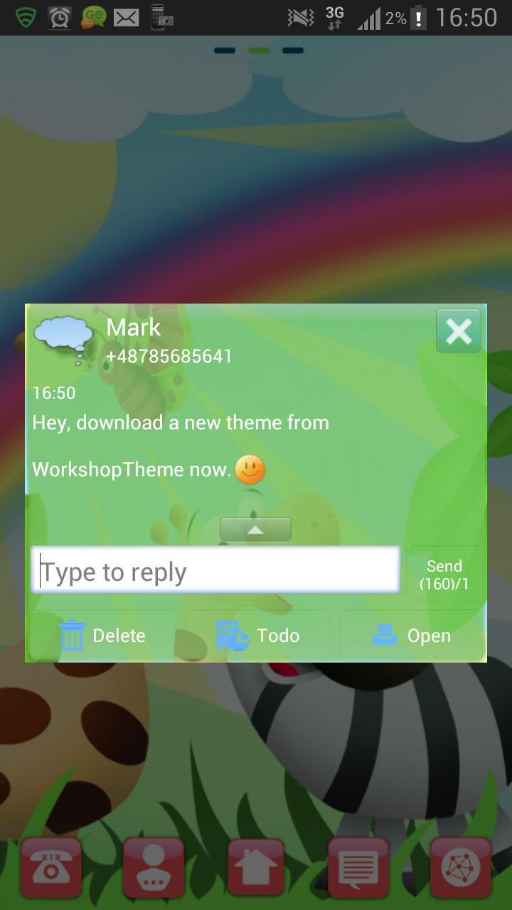 This unique, fairytale Animals Theme GO SMS Pro was created for all who love animals. Giraffe with long neck in brown patches, beautifully posing for pictures. Amused zebra tail waving merrily, colorful parrot sitting quietly among the leaves on a tree. A few pink butterflies flying around lazily over the green grass - this picture wallpaper zoo. This whole cluster, illuminated yellow sun and sunbeams staying in the meadow full of colorful flowers. Above them, the blue sky and the rainbow mosaic of colors that beautifies the surroundings. Theme Zoo will cheer up anyone who will have the theme on your phone. If you have not already, it is necessary to download this application gosmspro for free from Google Play.
