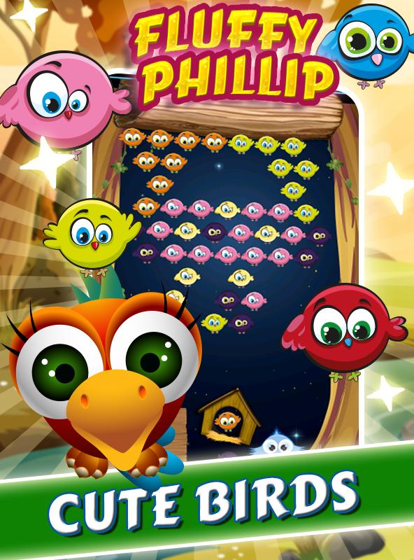 على الرغم من أن Fluffy Philip كسول ، إلا أنه سريع في وضع الطيور اللطيفة الملونة على قاذفة عش الطيور. أيقظ الطيور النائمة وجعلها تطير برميها على نفس مجموعات الألوان. لا يمكن لهذه الطيور الصديقة الطيران بمفردها ، فهي بحاجة إلى أصدقائها للطيران. لذا اجمع ثلاثة طيور أو أكثر معًا من خلال مئات من مستويات الألغاز والأروقة!