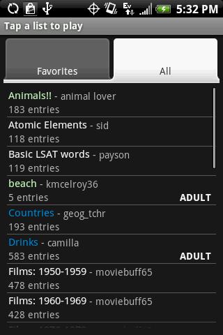 أعلى القوائم: عيد الفصح ، هوليوود ، المشاهير ، البرامج التلفزيونية ، الأفلام ، فرق اتحاد كرة القدم الأميركي ، فرق الدوري الاميركي للمحترفين ، مشروبات الكوكتيل ، الحيوانات ، البلدان! ادرس مع قوائم SAT و MCAT و GRE و GMAT و LSAT. أكثر من 60 قائمة للاختيار من بينها !!