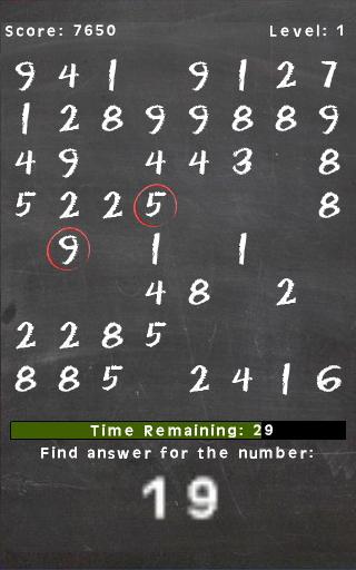 يحتاج اللاعب إلى مسح اللوحة باستخدام أي مجموعة من الأرقام لتحقيق النتيجة. أعداد من 1 إلى 9 منتشرة في جميع المجالات. يحتاج اللاعبون إلى تحديد عدد قليل من الأرقام لتحقيق نفس النتيجة على الشاشة. هناك حاجة إلى أرقام ما لا يقل عن 2 وما فوق لجعل الأرقام تختفي من اللوحة. العملية الرياضية المستخدمة هي إضافة. على سبيل المثال ، إذا كانت النتيجة المطلوبة هي 9 ، يمكن للاعب تحديد الرقم 4 و 5 ؛ أو 3 و 3 و 3 ؛ أو 1 و 2 و 3 و 3. كلما اختفت الأرقام في ذلك الوقت ، يمكن الحصول على المزيد من النتيجة.
