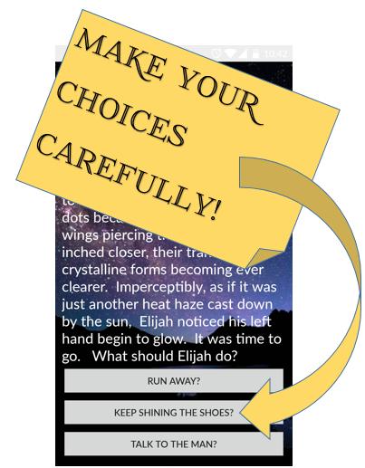 - في نهاية كل صفحة من الكتابة الأصلية ، تقرر خيارات إيليا! لا يمكن أن يكون من الأسهل الانغماس في عالم الخيال من Earthsky!