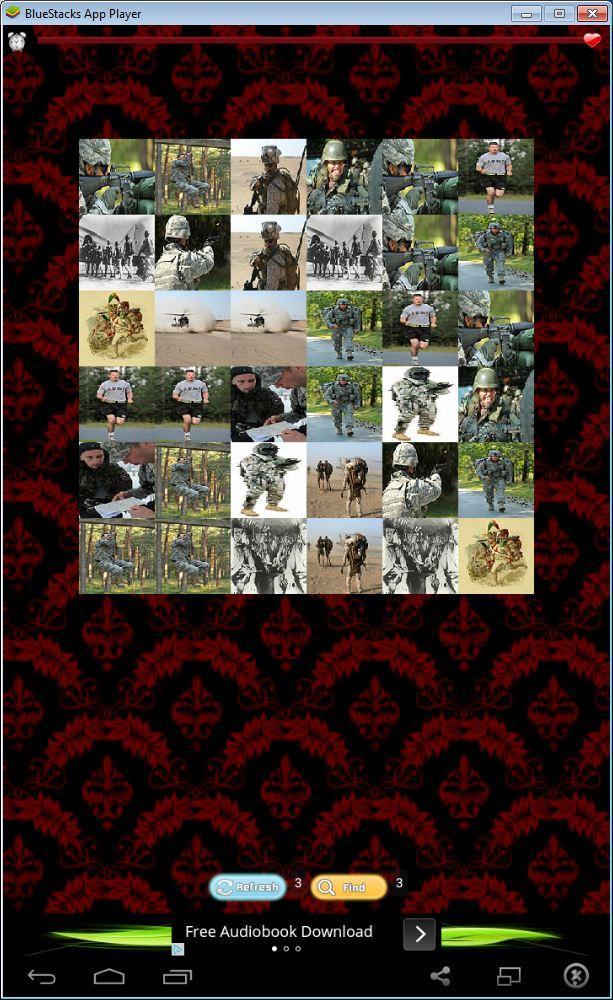 The game details are as follows: The forward arrow in Army Game takes you to the next round, while the middle button, the arrow that circles around, allows you to repeat a round with the same amount of time. Occassionally, the pieces of the puzzle will be configured in such a way that no link matches will manifest, therefore you have the opportunity to use the "Refresh" button three times to change the pieces around and allow you to move forward. (No obstacles will block your path to victory and accomplishment.) Also, sometimes you need a little help along your journal. Just hit the "Find" button and that link match that originally evaded your initial perception will be connected for you. It's okay, we're all human. (Sometimes, it's okay to just ask for help. As humans, we're meant to depend on each other.)