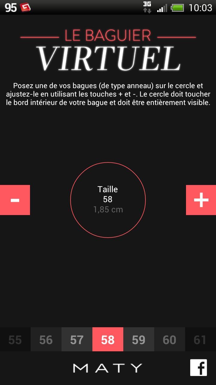 Easily find your finger tower with the Baguier MATY application! Place your ring on your phone screen and let yourself be guided. You can also share your finger laps on Facebook to give, why not, ideas for your friends!