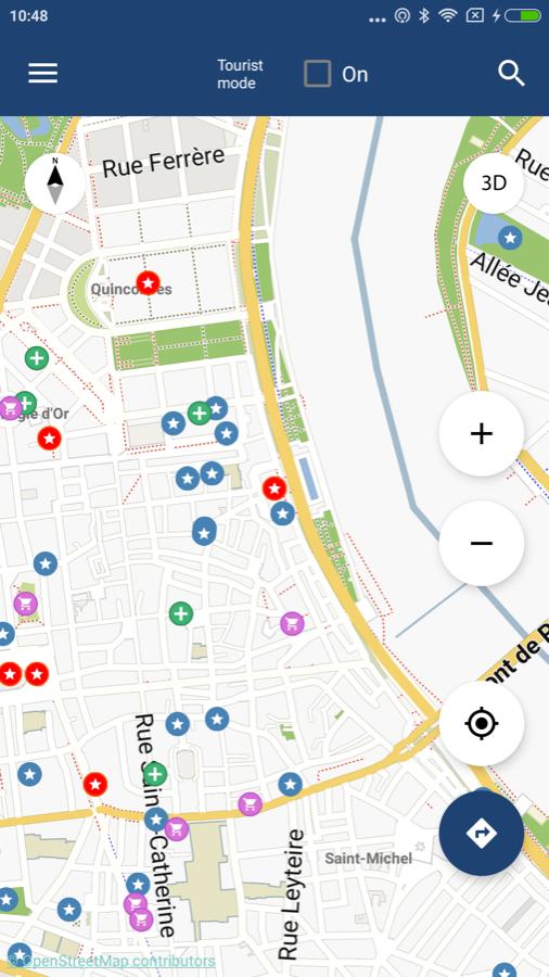 Off-line map of Bordeaux (France) - A free travel application. It will: map out the route, show sight-seeing attractions with photos and descriptions, find the nearest coffee shop or supermarket. Internet connection not required.