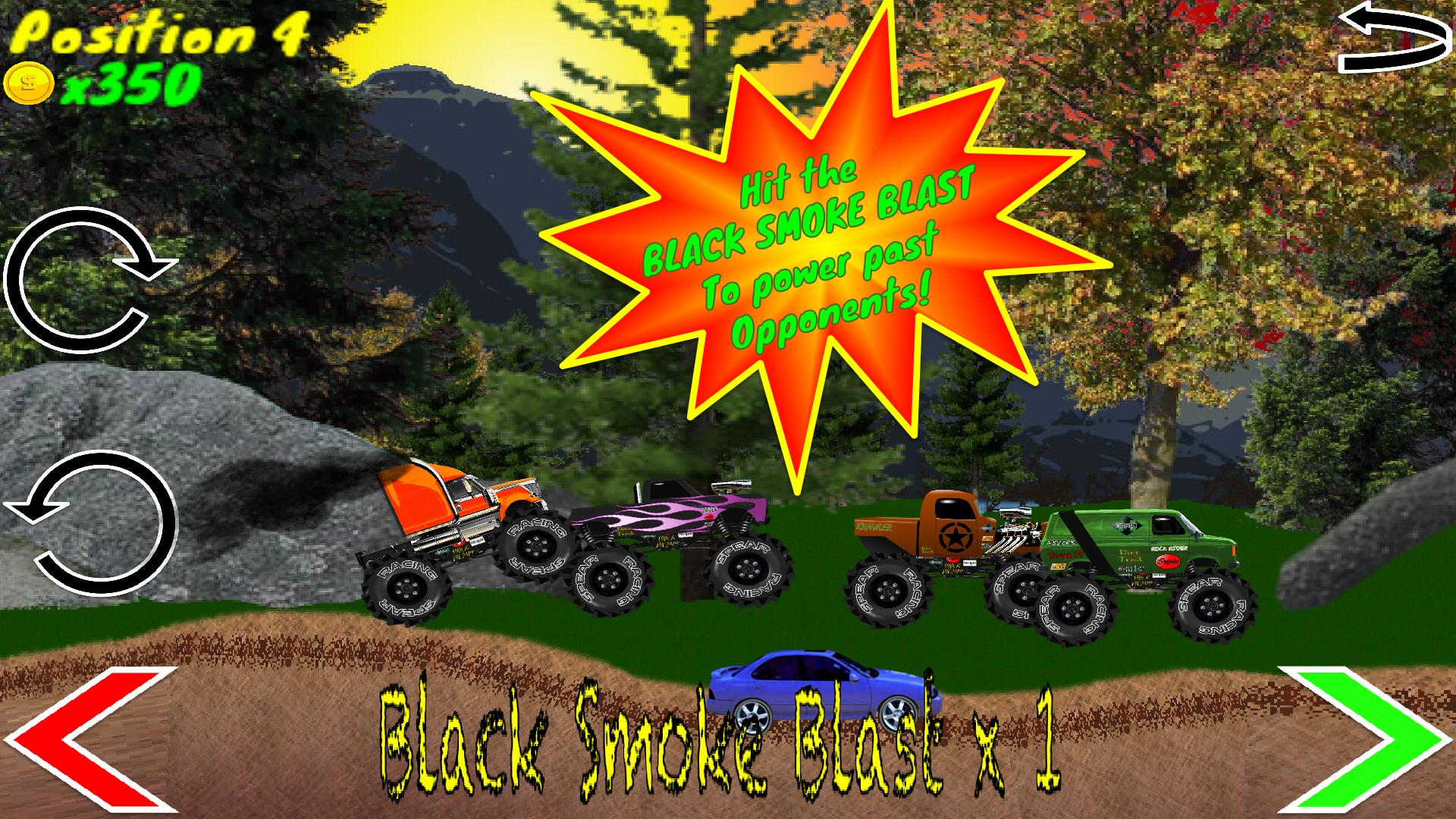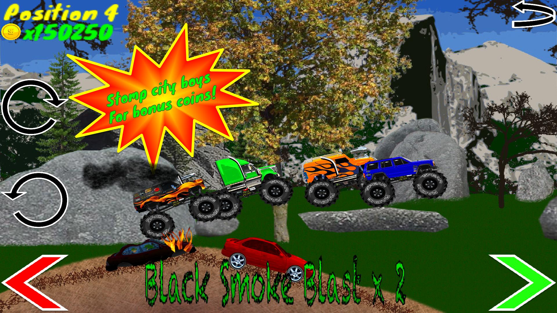 Race against other jacked up diesel trucks and smash city boys for bonus coins along the way. Use your coins to buy new trucks, upgrade your speed, change your paint job, and buy new places to race. Bust flips as you get massive air off jumps to earn some style coins, but make sure you land on your wheels or you'll be no better than those country fried city boys. Hit the "BLACK SMOKE BLAST" to slam the pedal to floor and send out a big black smoke cloud from your smoke stacks. Share your high scores so other country boys can see how many city boys you stomped. Every 5th level is a "CITY BOY RAMPAGE" where you get to stomp a ridiculous number of city boys. Featuring many country dirt road race locations, and also a glacier where you’ll need to break out the snow tires.