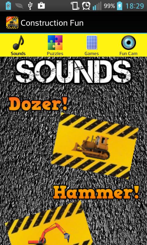 Grab your tools and get to work! If your child loves trucks, dozers and excavators then you will love our Construction Games for Kids free Activity App! Enjoy real life construction vehicle pictures and puzzles, listen to real machines hammer, scrape and crunch. You can also take a photo of yourself with a construction vehicle– or become a worker yourself with our Fun Cam in this interactive activity app designed for ages 2 and above.