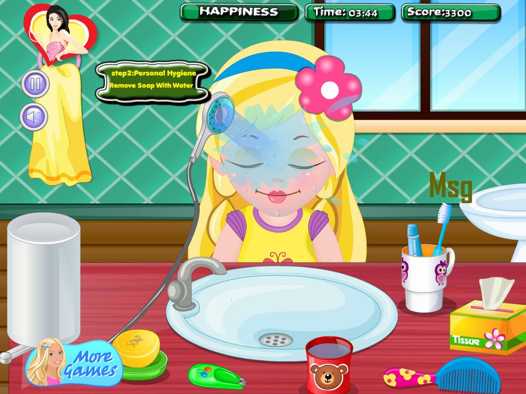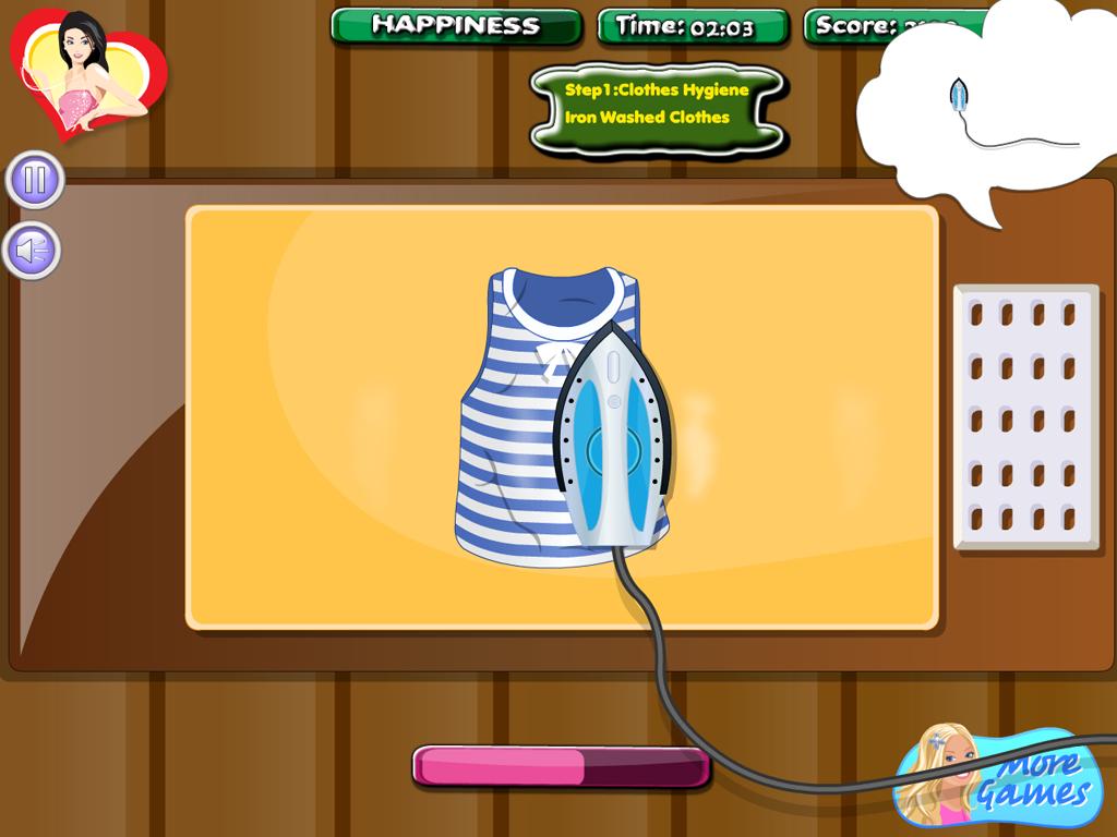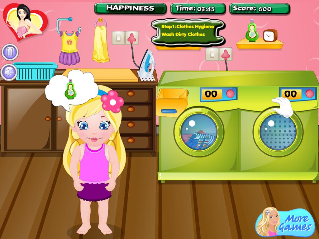 Play this new baby caring game and help baby Sophia learn an important lesson today by showing her how to wash her dirty clothes and how to iron them and then don't forget to also help her out with her personal hygiene session as well: wash her face and brush her teeth, cut her nails and comb her hair.