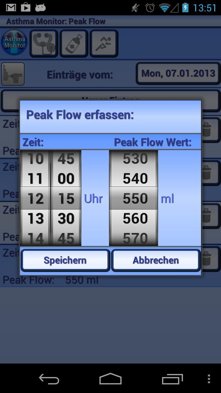 Die gesammelten Daten sind immer in Form einer interaktiven Grafik verfügbar. Die Spitzenflusswerte (Asthma -Ampselsystem) können einzeln erfasst werden.