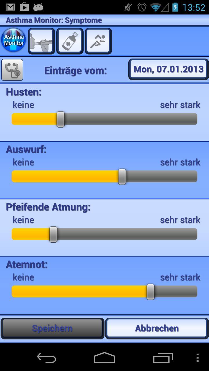 Die aufgezeichneten Daten können in wenigen einfachen Schritten erfolgen. Ihr Arzt wird in Form eines standardisierten Berichts per E-Mail benachrichtigt. ** Die grafische Darstellung der Daten zeigt immer, wie sich Ihr Asthma entwickelt hat, und kann für die Planung der nächsten Beratung mit Ihrem Arzt nützlich sein, um zu helfen.