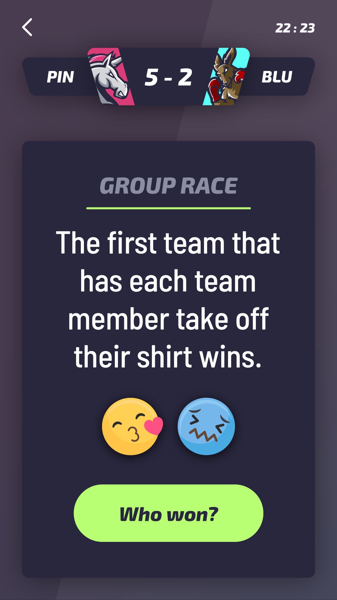 Teams treten in verschiedenen Herausforderungen und Spielen gegeneinander an, genau wie bei einem echten Sport. Die Verlierer müssen die Strafschüsse trinken und die Gewinner werden zum Trinkchampion gekrönt.