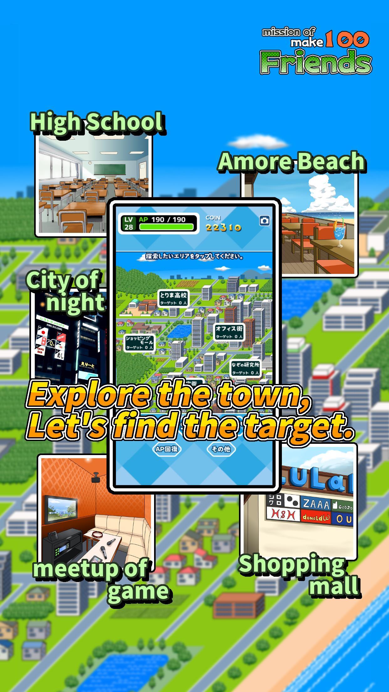 Erkunden wir verschiedene Bereiche wie High School, Amore Beach, City of Night, Treffen des Spiels und finden Sie das Ziel.