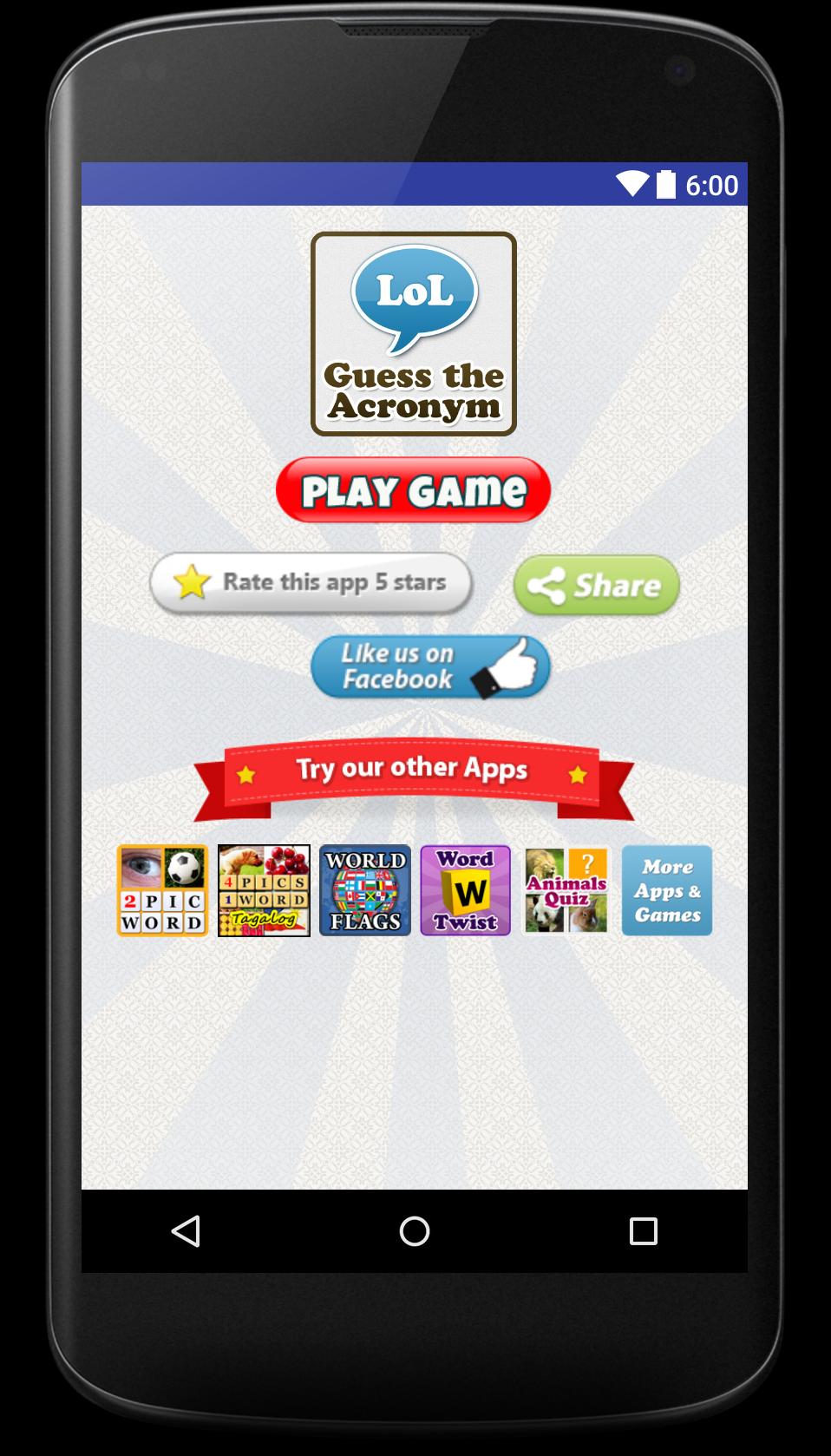 Es similar a nuestros otros juegos de palabras, 4 fotos, 1 palabra y 2 fotos, 1 palabra y cuestionario de sinónimo, pero esta vez es para acrónimos.
