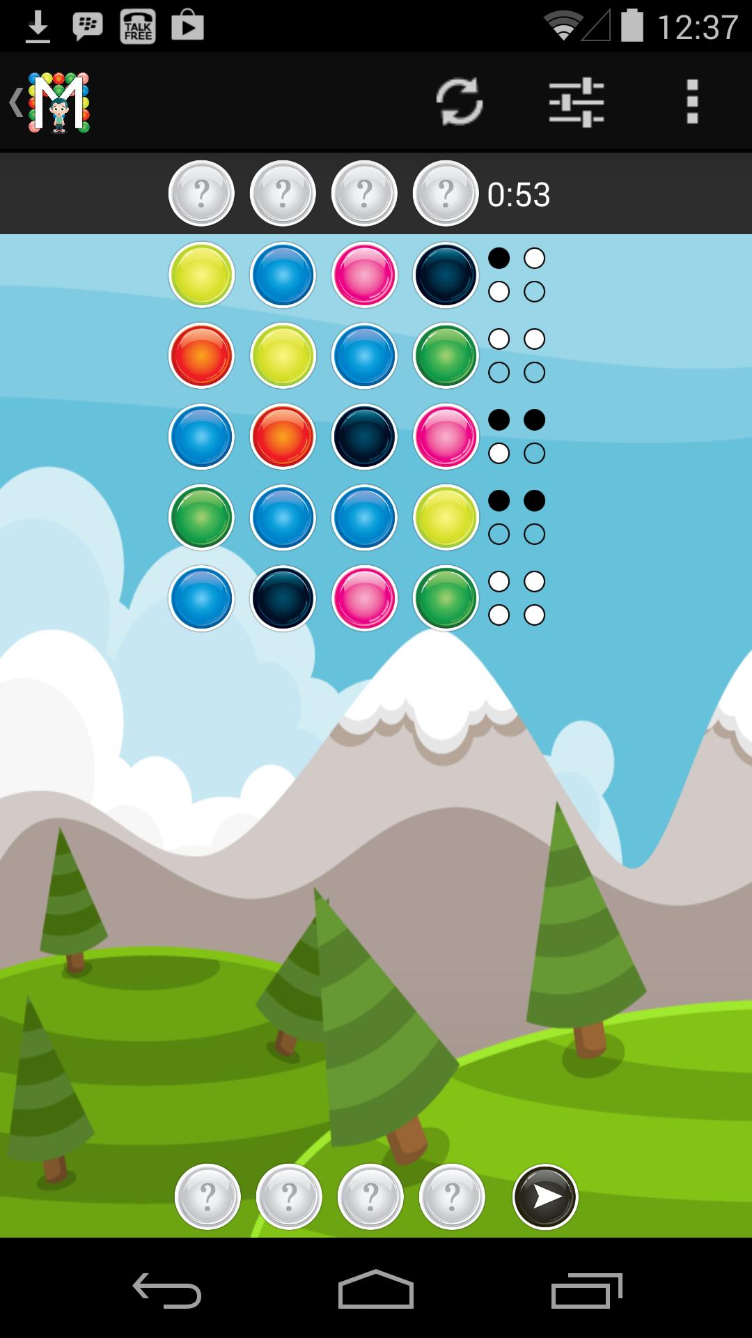 Mastermind es un juego que rompe el código para dos jugadores. El objetivo de Mastermind es adivinar el patrón creado por la computadora o un oponente humano. Después de seleccionar su combinación de colores desde la parte inferior de la pantalla, envíe sus opciones. Una vez enviado, su suposición aparecerá en la parte superior junto con pequeños círculos a la derecha.