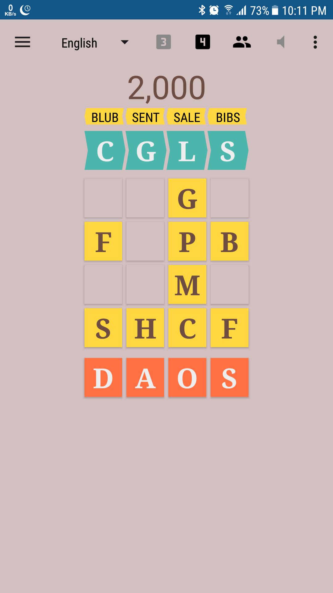 Recibe 100 pts para una palabra de 3 letras, 200 para una de 4 letras y una bonificación de 1000 pts si limpia los azulejos amarillos.