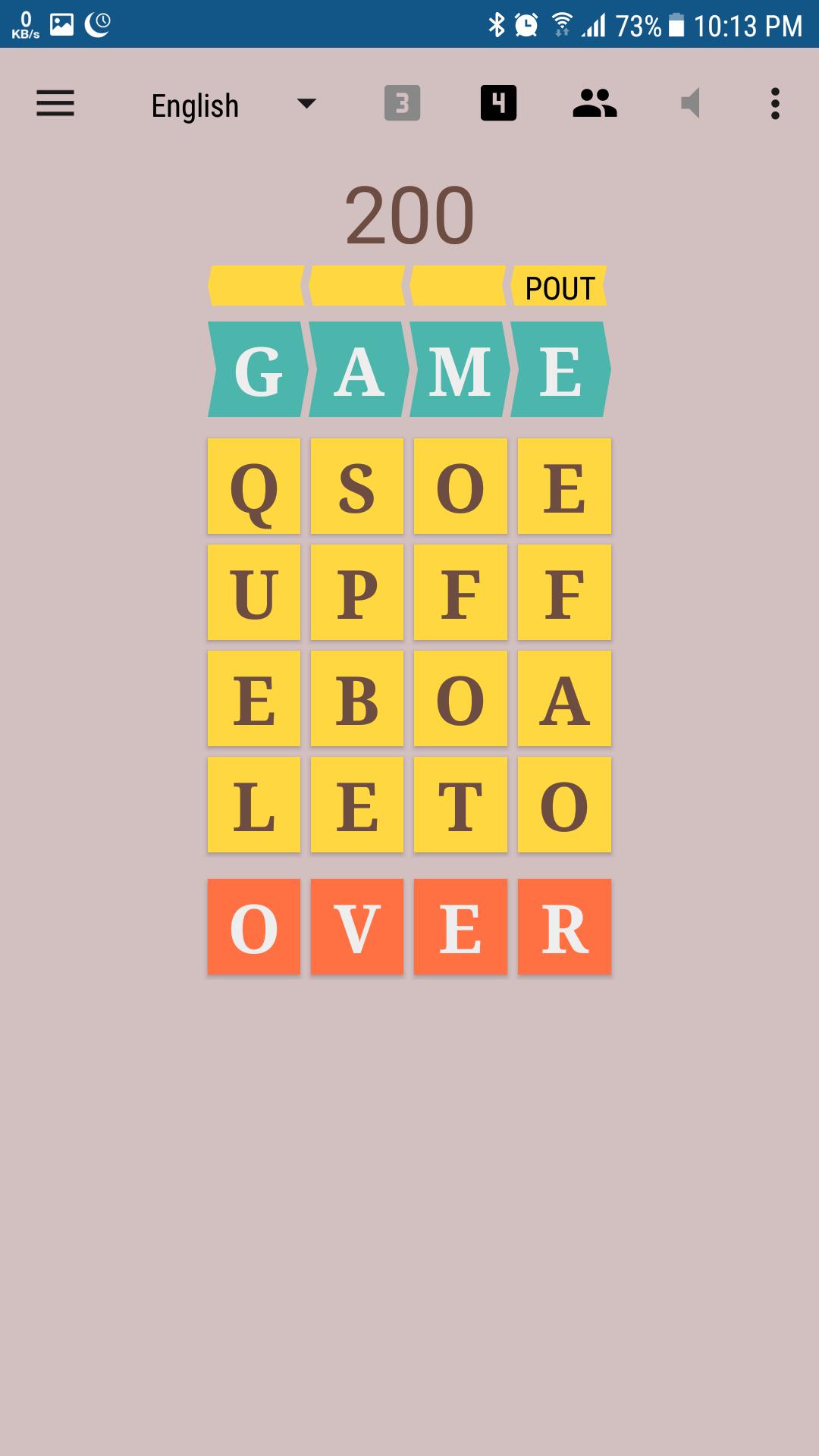 El final ideal de un juego ocurre cuando todas las baldosas amarillas se vuelven en blanco. Obtienes un bono de 1000 puntos por lograr eso. Un final menos lucrativo es cuando las baldosas amarillas están llenas de letras, pero No More Words .