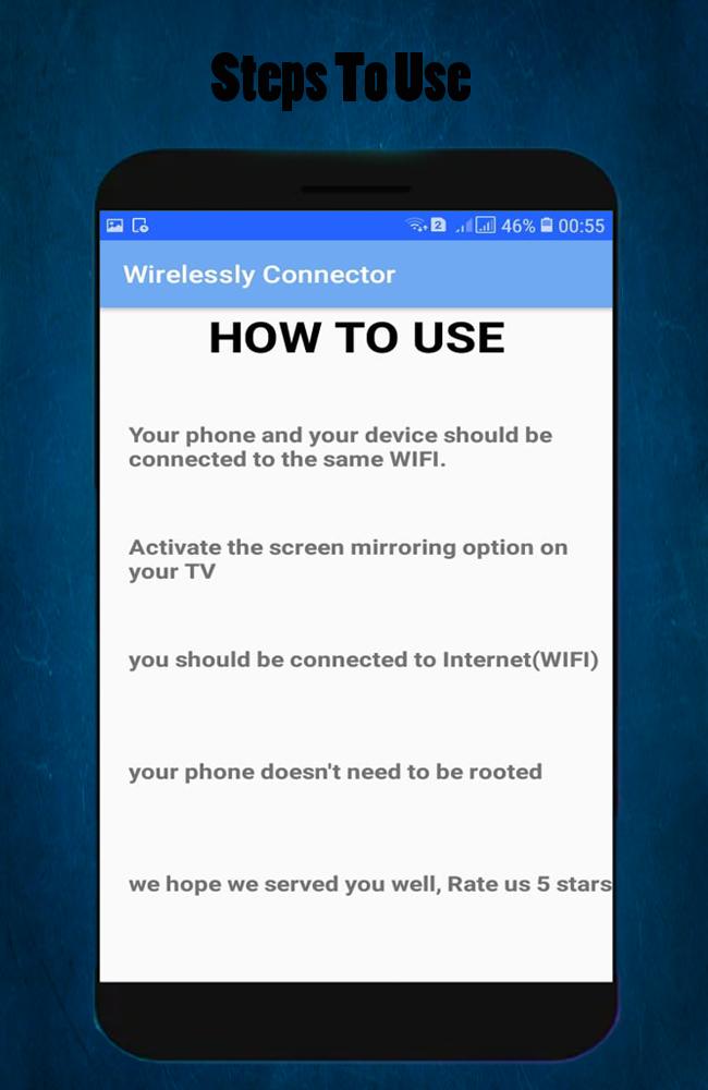 Wirlessely Connect es una técnica que le permite conectar su teléfono en la pantalla de TV. Puede acceder fácilmente a todos sus juegos, fotos, videos y otras aplicaciones en una pantalla grande utilizando la aplicación Wirelessely tv connector .