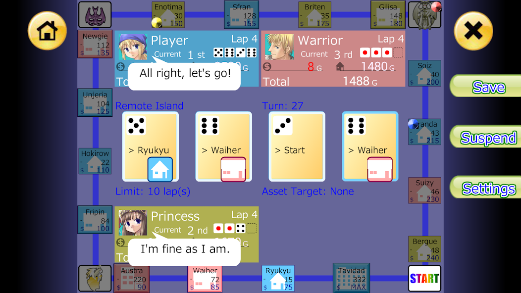 Sélectionnez une carte et progressez dans la carte. Lorsque vous atterrissez sur un espace, quelque chose peut arriver ou vous pourrez peut-être acheter une propriété.