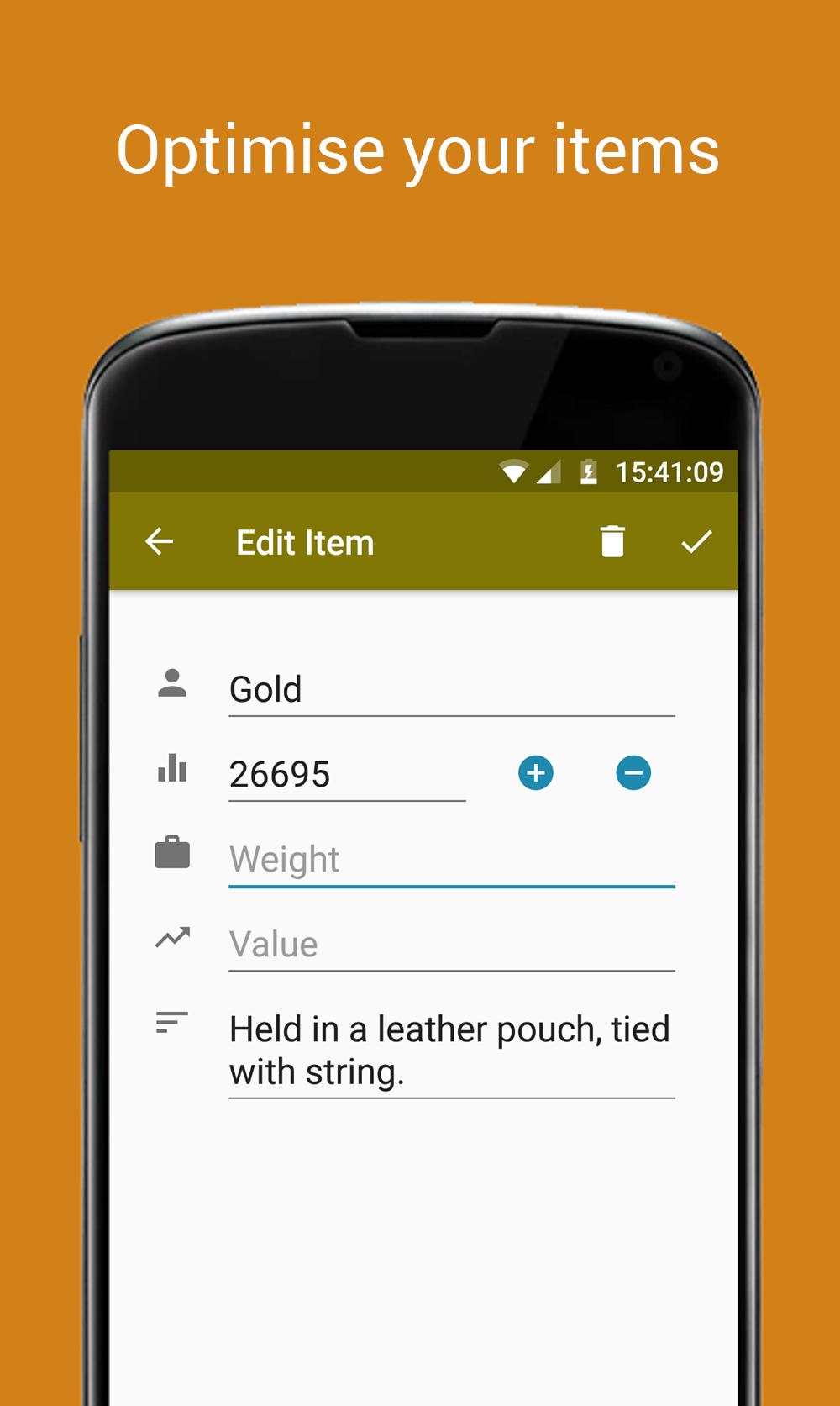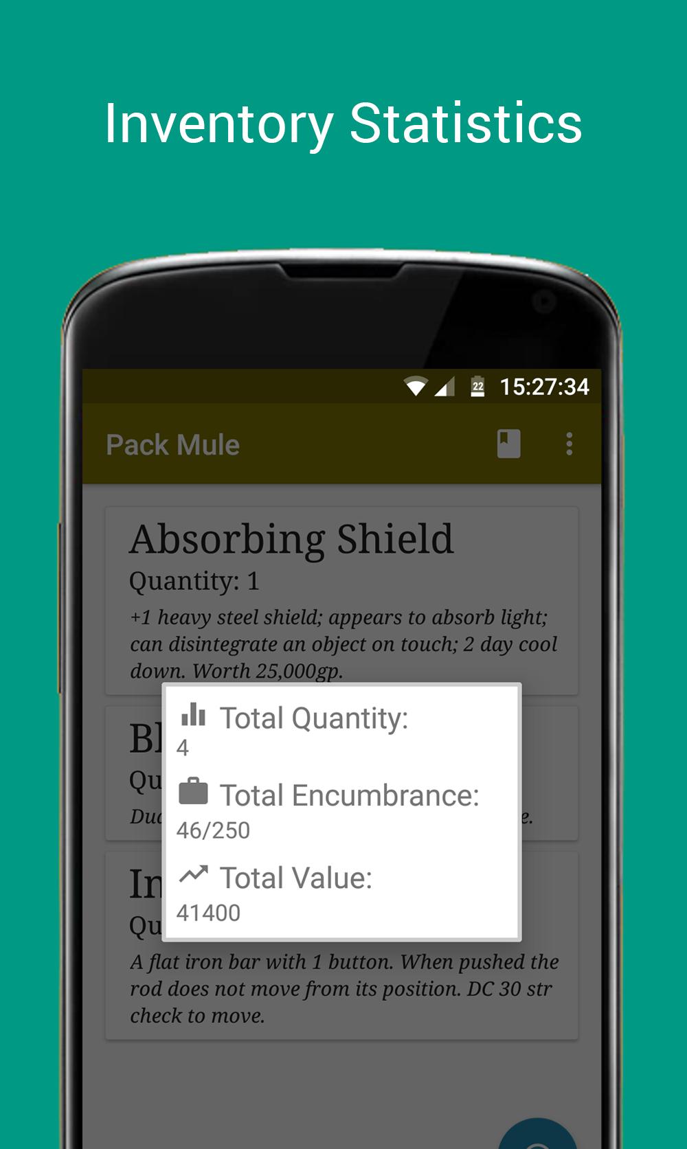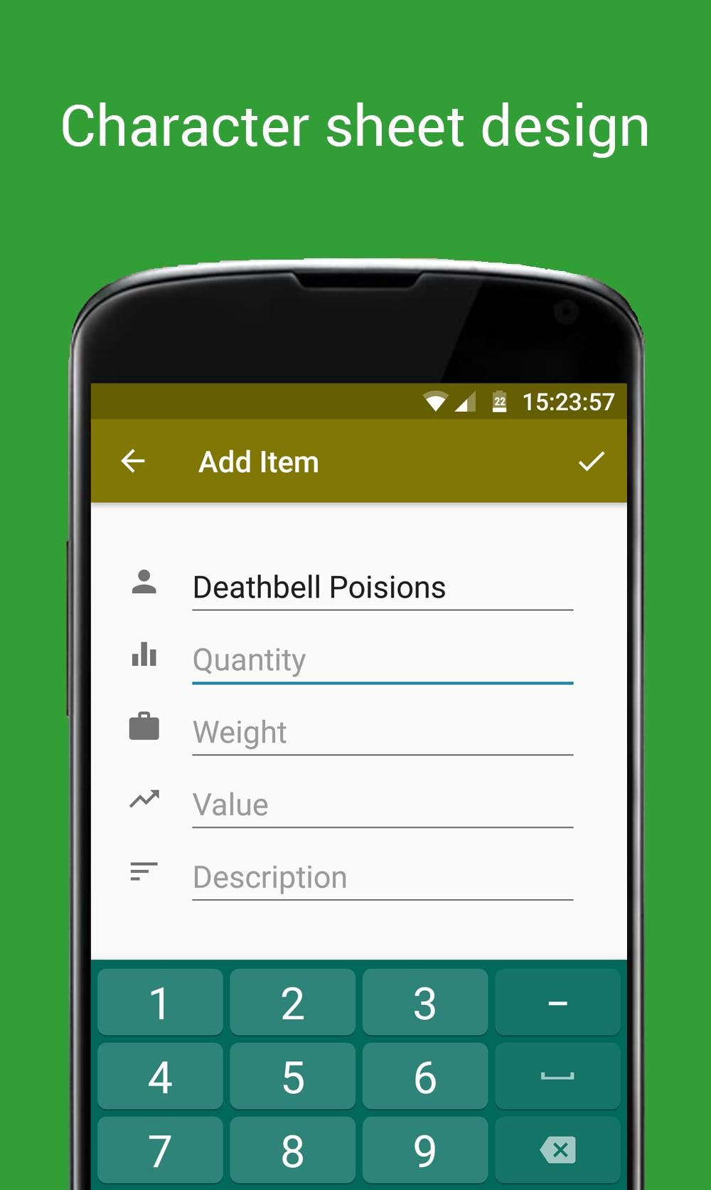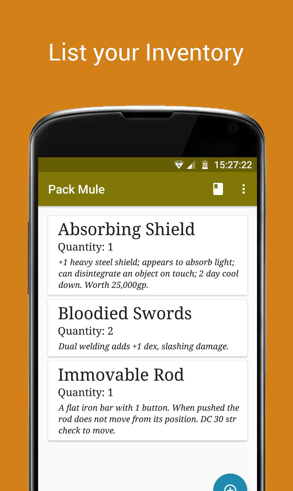 En adaptant le style d'inventaire éprouvé pour écrire simplement un nom, une quantité et une description - votre donjon et dragons, pathfinder ou tout autre jeu de rôle auront un inventaire sans effort, vous ne retournerez jamais au stylo et au papier.