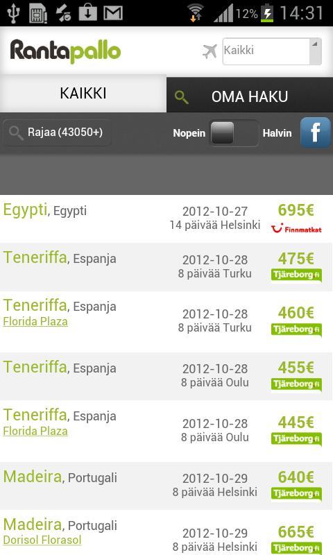 La demande de départ soudaine de Rantapallo trouvera les départs soudains de tous les principaux voyagistes. Comprité Finnmatkat, Aurinkomatkat, Tjäreborg, Apollomatkat, voyages de vacances, Dertur et autres voyagistes et bureaux.