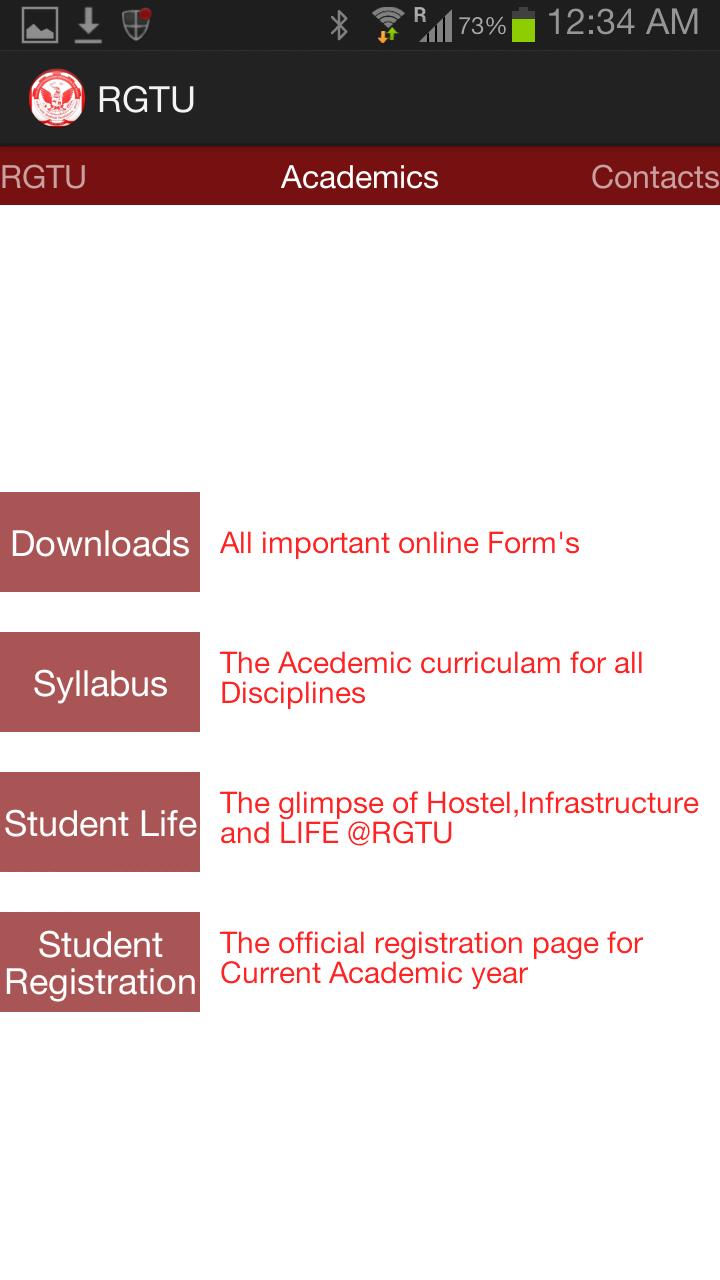Rajiv Gandhi Technical University Android Application fait partie d'une initiative plus large de Leotaur pour améliorer l'expérience mobile des étudiants de Rajiv Gandhi Technical University. Cette application fournit la vue du site officiel sur le produit Android. La demande est conçue pour fournir aux étudiants et aux candidats toutes les informations concernant les résultats, les événements, l'admission, les cours offerts, etc.