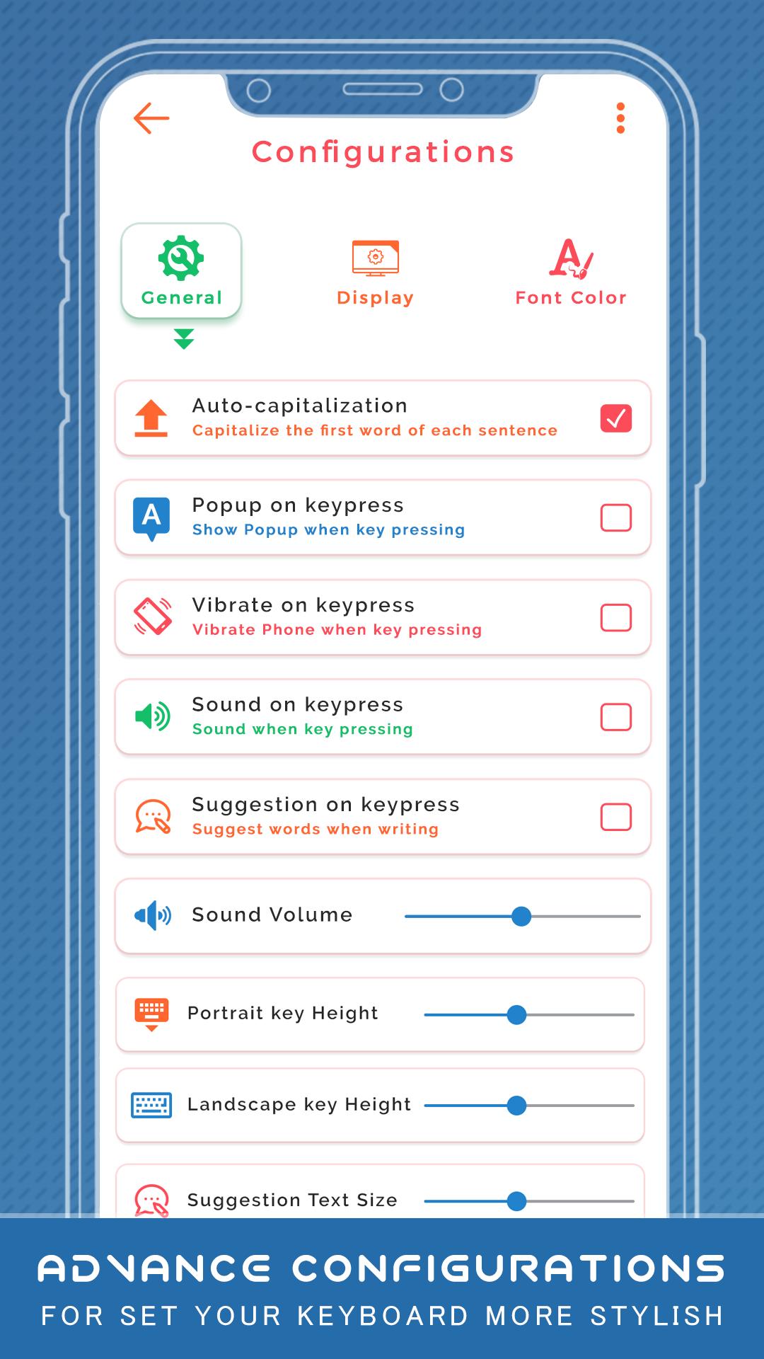 9) Add setting facility related to General setting, Display Setting, Font color Setting with best options.
