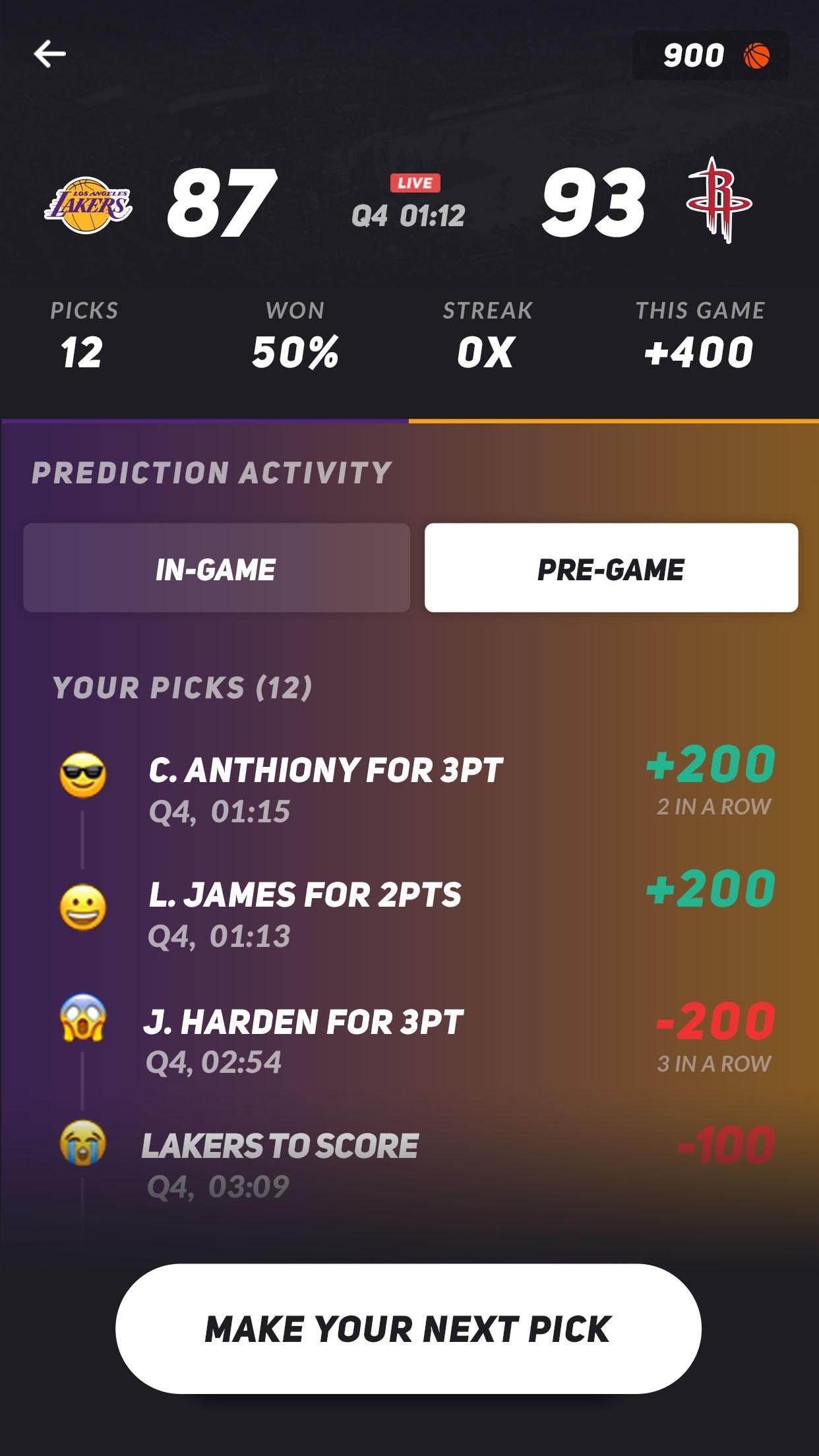 Plus, when there are no live picks or games available, you can practice general predictions over future games (winners, top scorer, total points etc.) and get free rich pre-game stats and analysis.