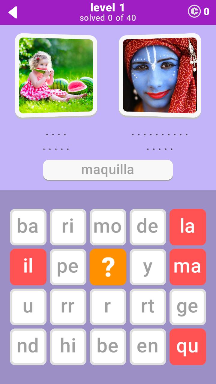 写真ごとに2つの単語。レベルごとに40語。ゲーム内の680 Words 。それらすべてを見つけることができますか?時々、あなたは明白なことを超えて考える必要があります。幸運を!