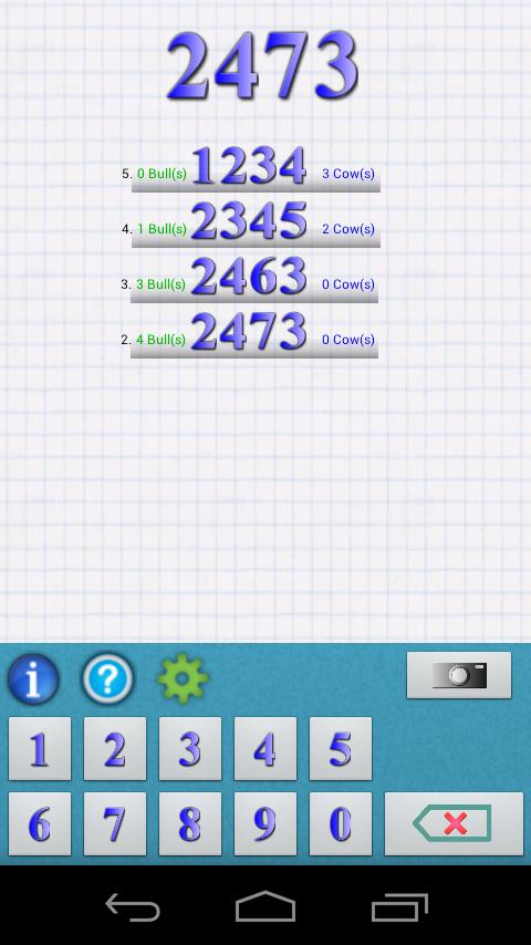 Androidは4桁の秘密番号を書きます。数字はすべて異なる必要があります。次に、プレイヤーは数を推測しようとします。 Androidは一致数を与えます。一致する数字が正しい位置にある場合、それらは「雄牛」であり、異なる位置の場合、「牛」です。
