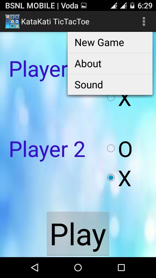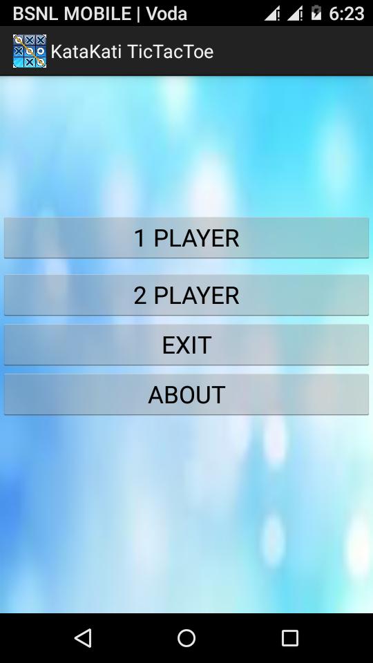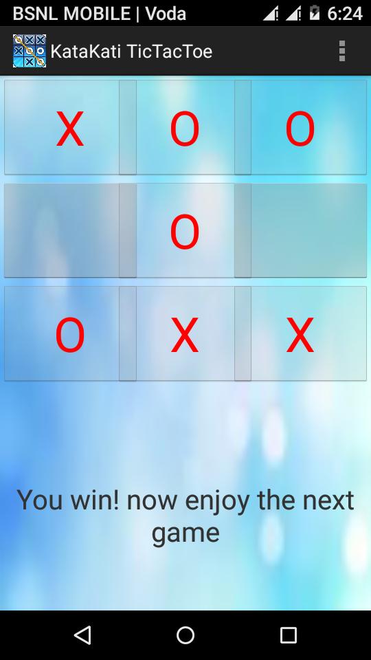 KataKati -TicTactoe (XO) is a android game. You can play this game with mobile or with your friend.This game is for any age group from kids to adults.It is a great way to pass your free time. It Consist of 3*3 grid .The Player succeeds in placing three respective marks in horizontal, vertical or diagonal Line wins.This game gives us a voice output.