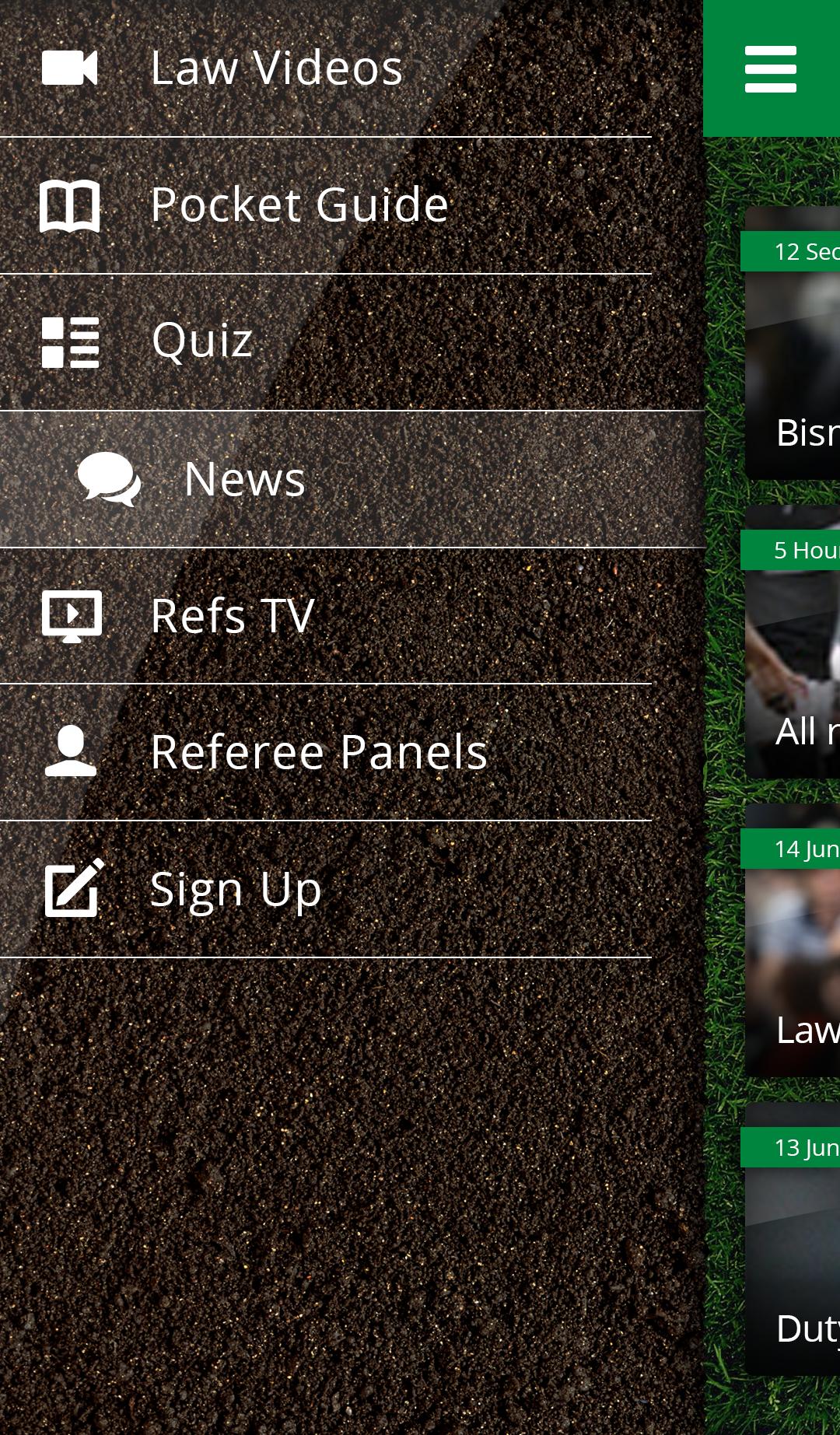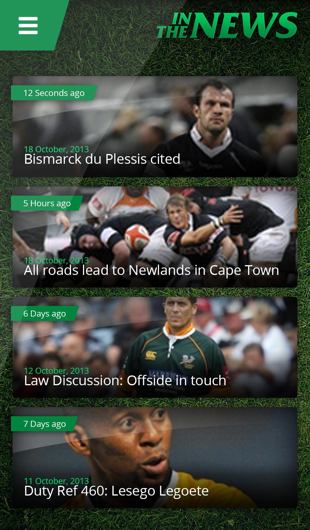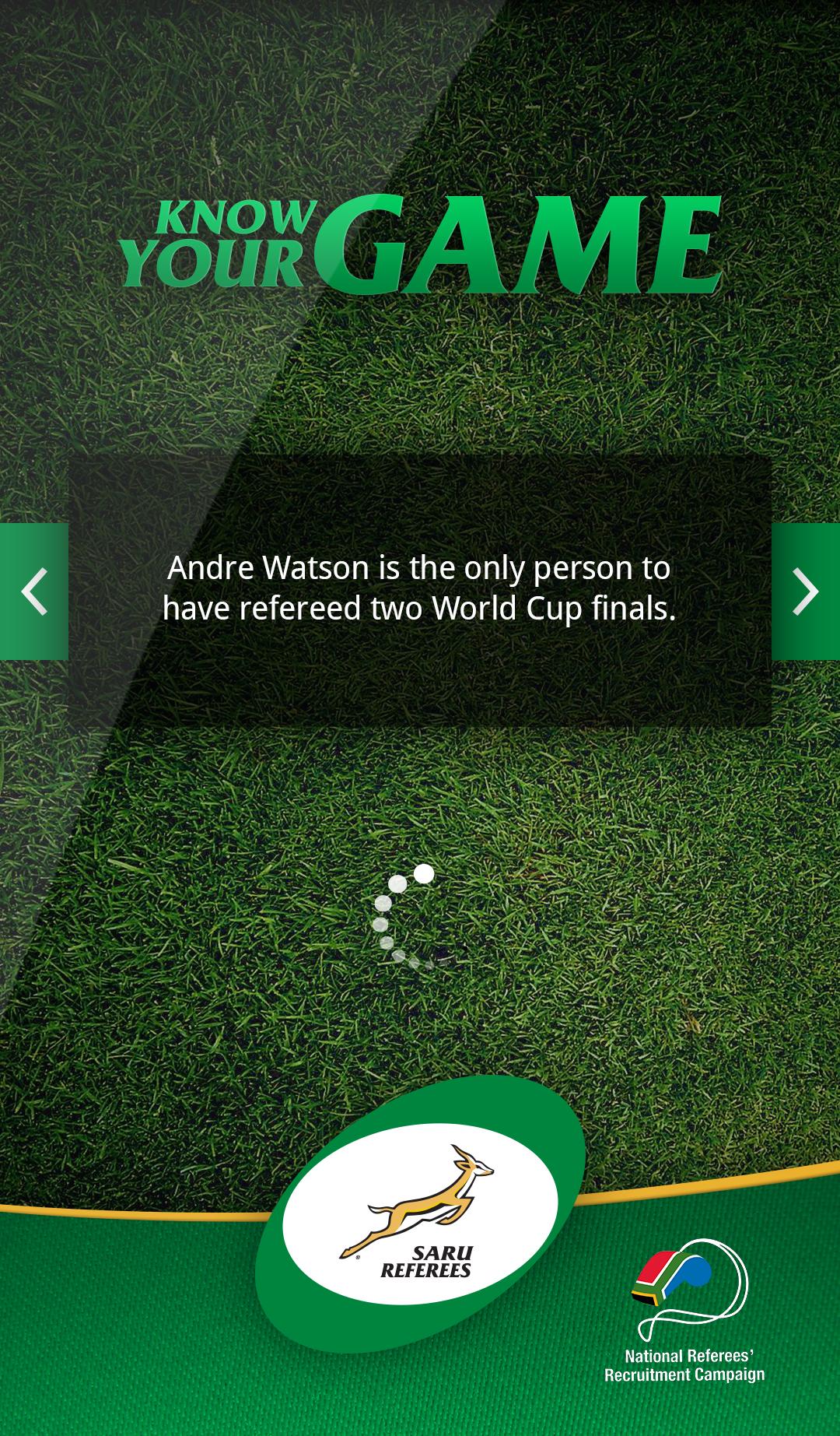 응용 프로그램에는 다음이 포함됩니다. 각 법의 가장 중요한 측면을 강조하는 법률 책의 추출물; 남아프리카 최고 심판의 프로필; 최근 게임에서 논쟁의 여지가있는 결정을 설명하는 비디오 클립; 심판 뉴스; 법률에 대한 훈련 클립; 정기적으로 업데이트되는 퀴즈로 스스로 테스트 할 수 있습니다. 심판이되기 위해 가입 할 수있는 기회. 전체 법률 책을 이메일로 보내도록 요청할 수도 있습니다.