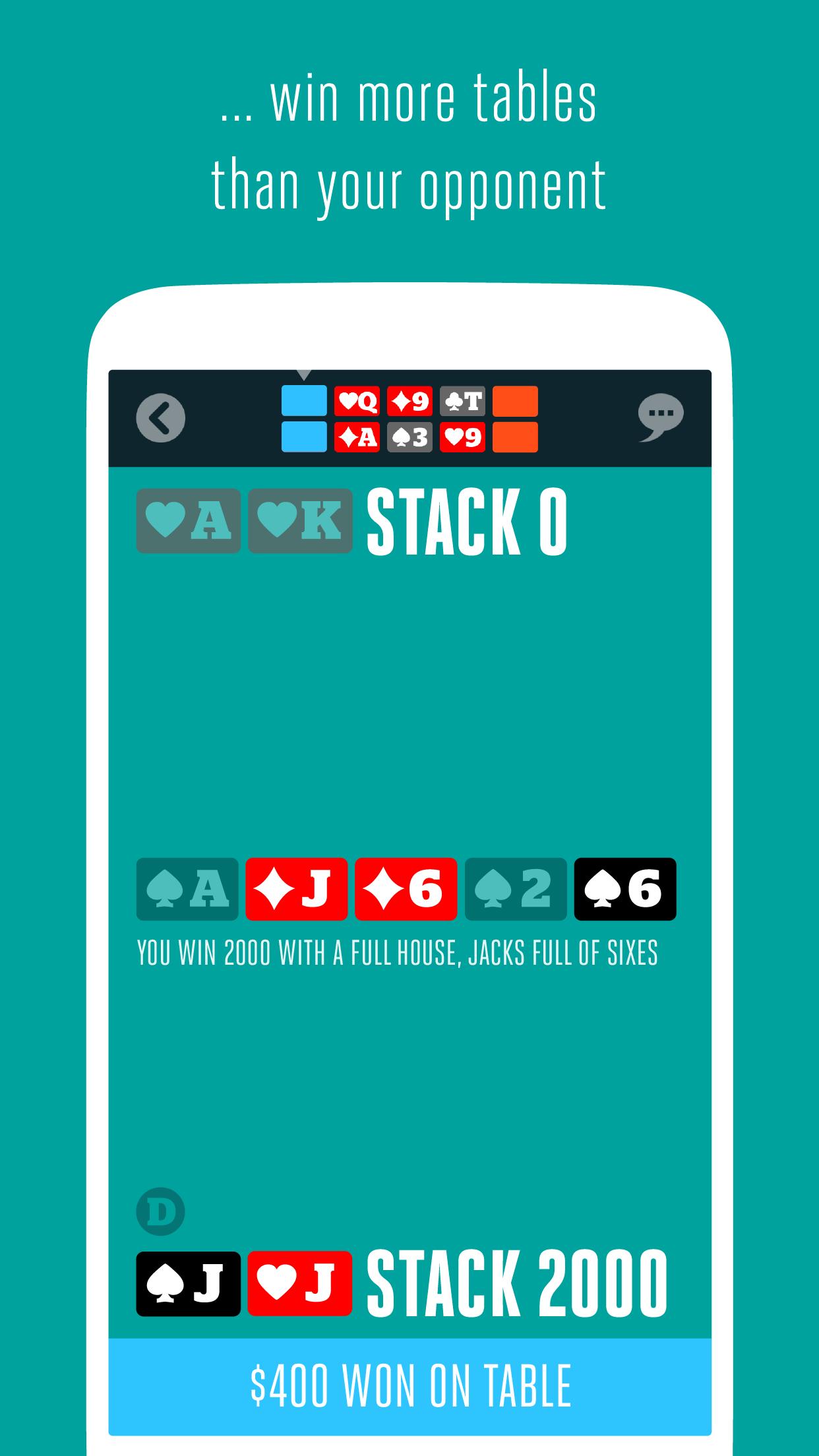 Each game is a tournament where you play 3, 5 or 7 Texas Hold’em tables at the same time versus a friend or random opponent. Win more tables than your opponent to be crowned the God Of Poker.