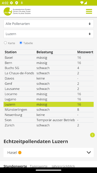 The «Pollen-News» app informs you in real time about the pollen load in Switzerland. You can see live how strong the current load of different types of pollen is at the measuring station you have selected. You can find out how much pollen to expect in the two following days in the pollen forecast. Plus: You can set up your personal pollen push (pollen type/region). If the pollution value of the selected pollen type increases, you will receive a push notification. Also in the app: important tips for dealing with pollen allergies and offers from aha! Allergy Center Switzerland. The pollen information comes from the Federal Office for Meteorology and Climatology MeteoSwiss.