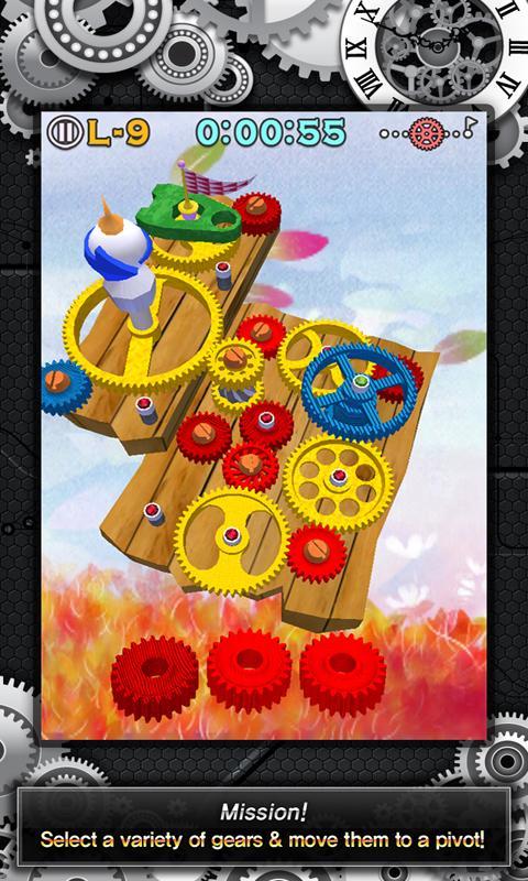 As engrenagens vermelhas dinâmicas estão girando continuamente. Seu objetivo é transferir energia para um pivô com bandeiras voadoras, vinculando várias engrenagens da maneira certa. Considere todos os elementos com sabedoria, como a forma de engrenagens, tamanhos, estruturas de mapa e engrenagens organizadas.