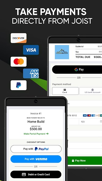 • Aceite pagamentos dos clientes - Aceite pagamentos com cartão de crédito diretamente de seus clientes através Joist , para que você possa parar de perder horas dirigindo para pegar cheques e depositá -los no banco.
