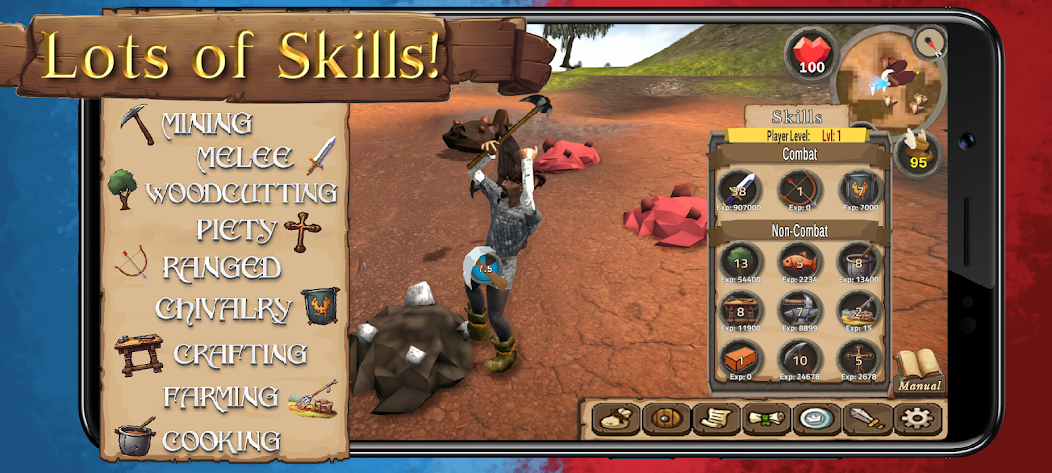 *Sistema diversificado de habilidades: domine várias habilidades, incluindo cortes de madeira, pesca, culinária, artesanato, corpo a corpo, cavalaria, alcance e muito mais.