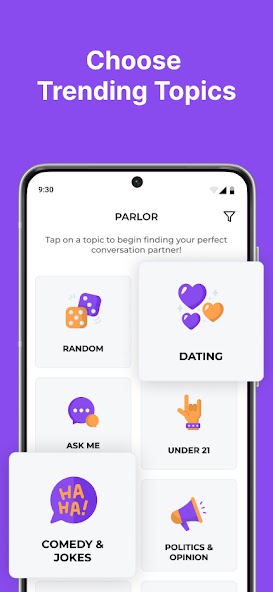 As melhores conversas acontecem quando duas pessoas querem falar sobre a mesma coisa ao mesmo tempo. São conversas como aquelas que criam amizades ao longo da vida. Se você está sentado um ao lado do outro em uma Parlor , ou Parlor de unhas ou no aplicativo Parlor . Selecione seu tópico e se conecte instantaneamente com outro usuário que deseja falar sobre a mesma coisa.