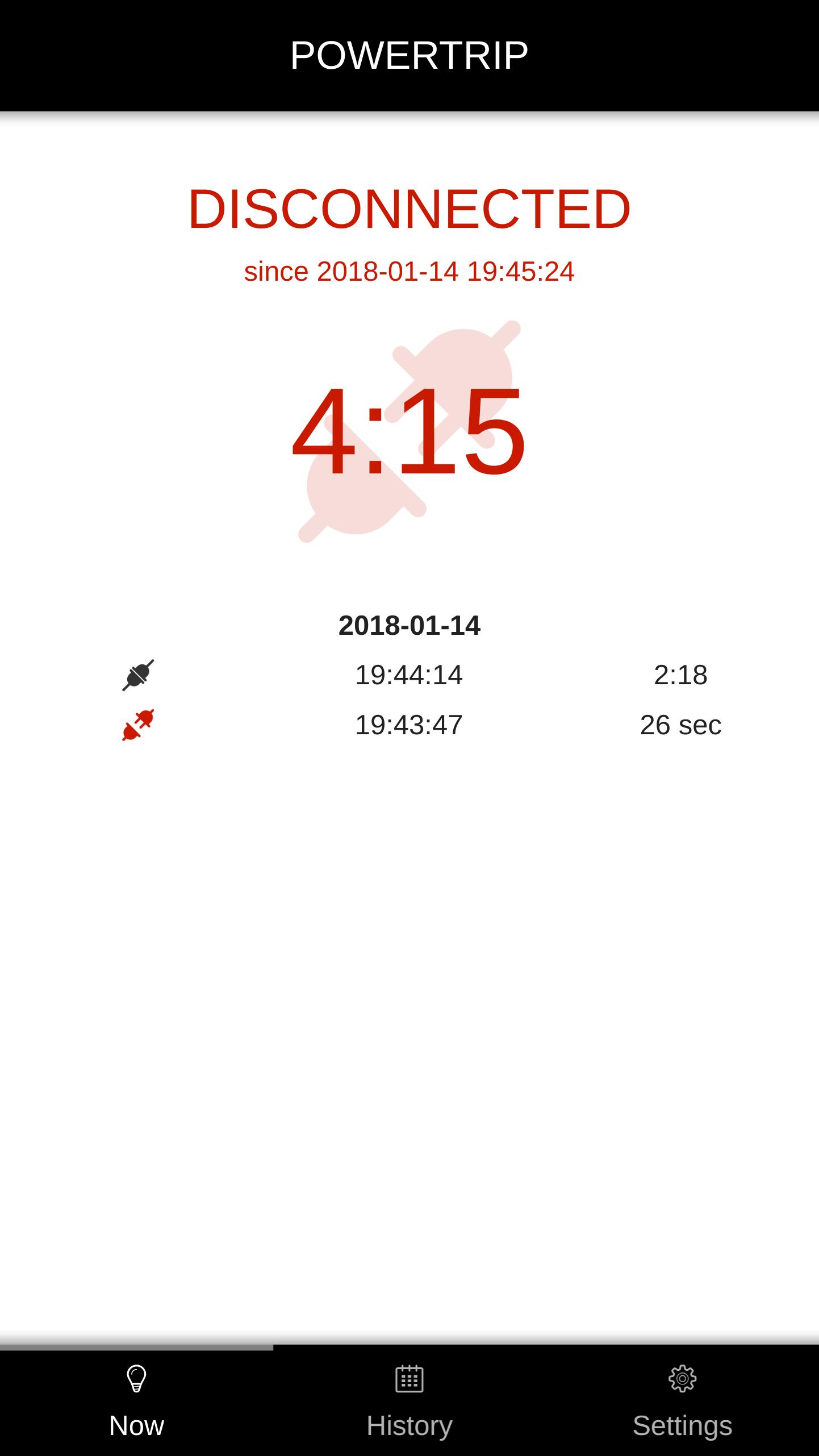 História das quebras de poder, incluindo carimbo de hora e duração.