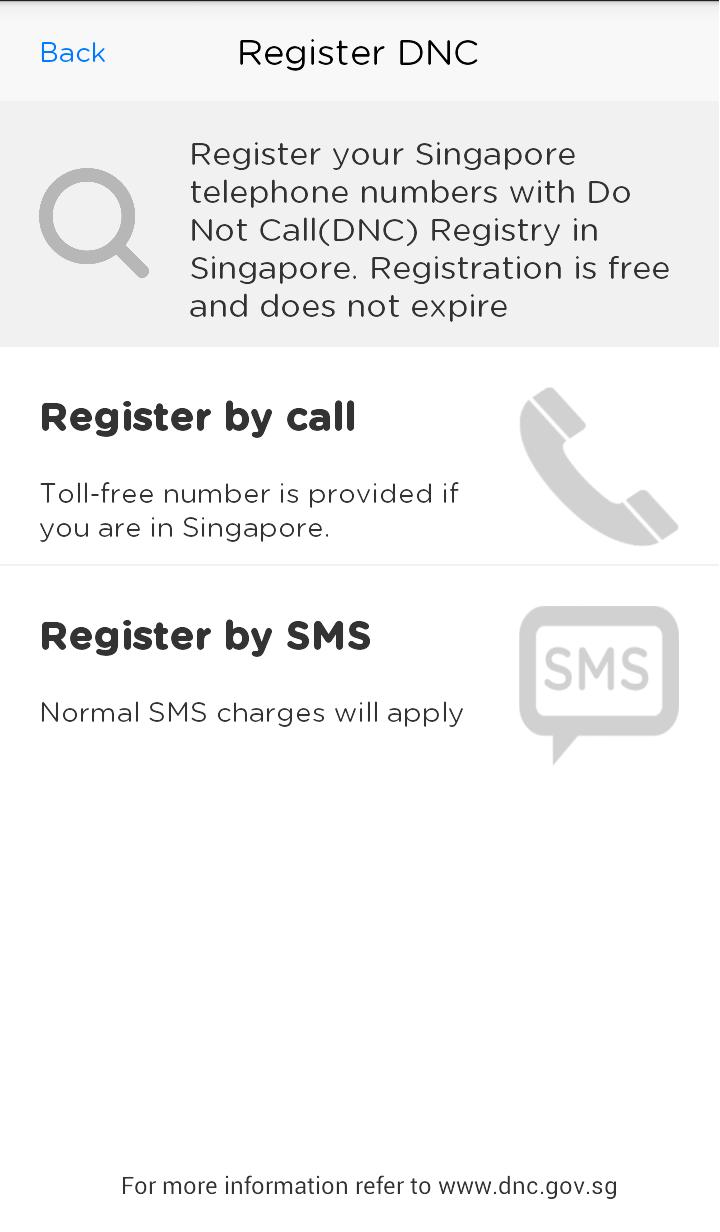 Você pode usar este aplicativo para registrar seu número de telefone na lista nacional de DNC de Cingapura facilmente.