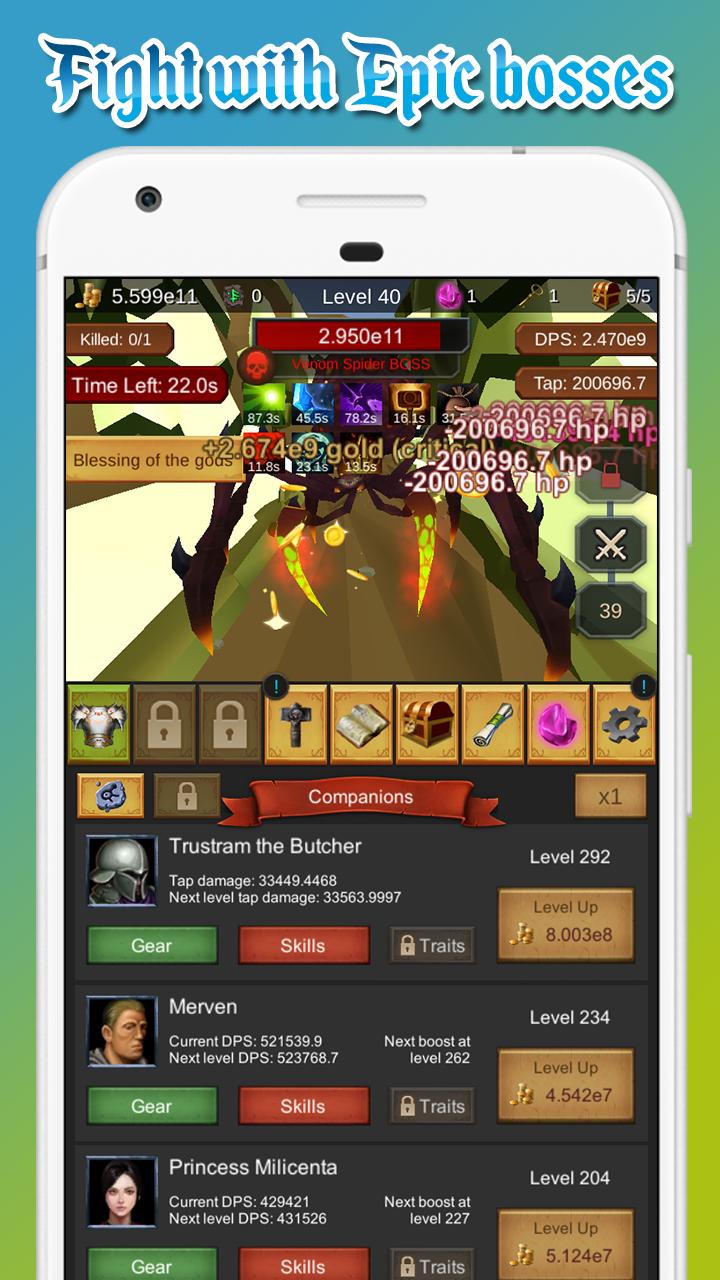 ★ Leve seus companheiros para desbloquear feitiços e obter vários benefícios, como aumento do DPS, dano da torneira e queda de ouro.