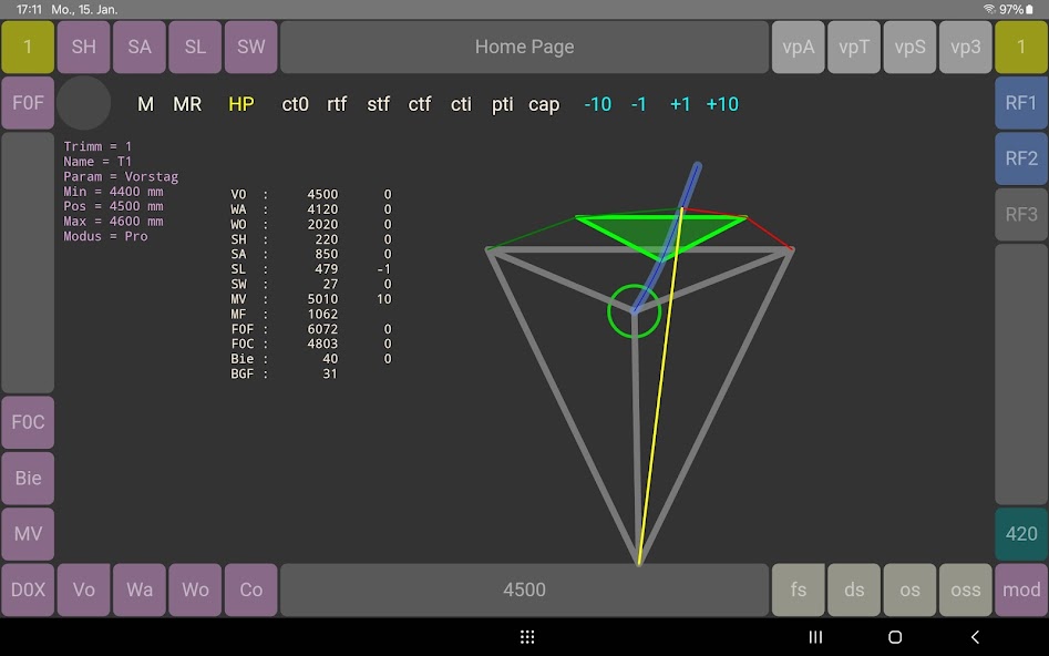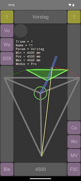 Uma simulação de rig-trim para barcos a vela, 420 classe. Você pode mudar o comprimento da Forestay, ou o comprimento das mortalhas. Os espalhadores também são ajustáveis. O gráfico mostra a situação atual. Ao introduzir uma junta no ponto D - a posição de fixação do espalhador no mastro - a estrutura é modelada como uma ligação mecânica.