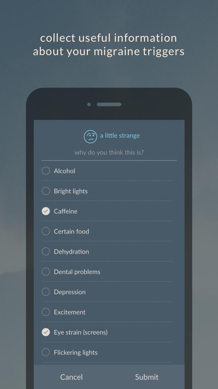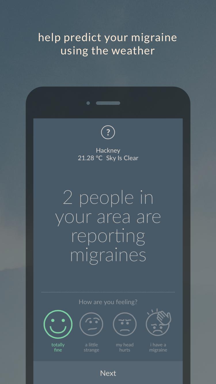 Muitos que sofrem de enxaqueca podem sentir uma "aura" antes do início da enxaqueca. Ao enviar sua própria condição, informações detalhadas são coletadas sobre o clima exato em sua área, permitindo que as causas da sua enxaqueca sejam analisadas. Dessa forma, mais de 40 peças de dados exclusivos ajudam a criar uma impressão digital associada à sua enxaqueca.