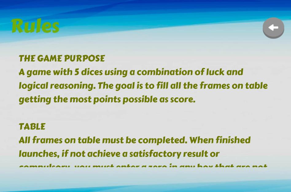 Role os dados para obter a pontuação mais alta por rodada. Uma mesa deve ser preenchida e no final quem obtém a maior pontuação será o vencedor. O jogo termina enchendo a mesa inteira com um total de 52 rodadas. Yahtzee, Yatzy, Yams, Generala, Jatsi, Yacht e Yamb