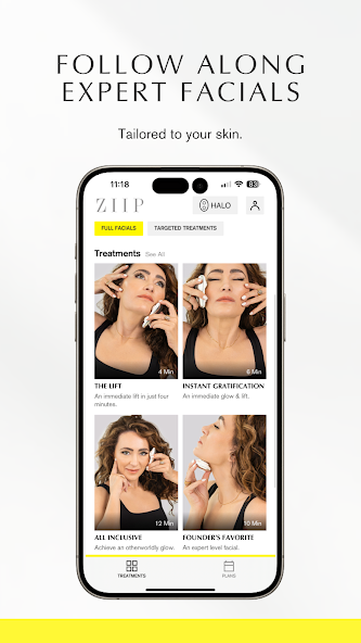 Para complementar o tratamento de elevação pré-programado em cada auréola do Ziip, o aplicativo ZIIP oferece uma coleção com curadoria de tratamentos faciais completos e tratamentos direcionados, utilizando a tecnologia nanocorrente e microcorrente para fornecer resultados imediatos e duradouros.