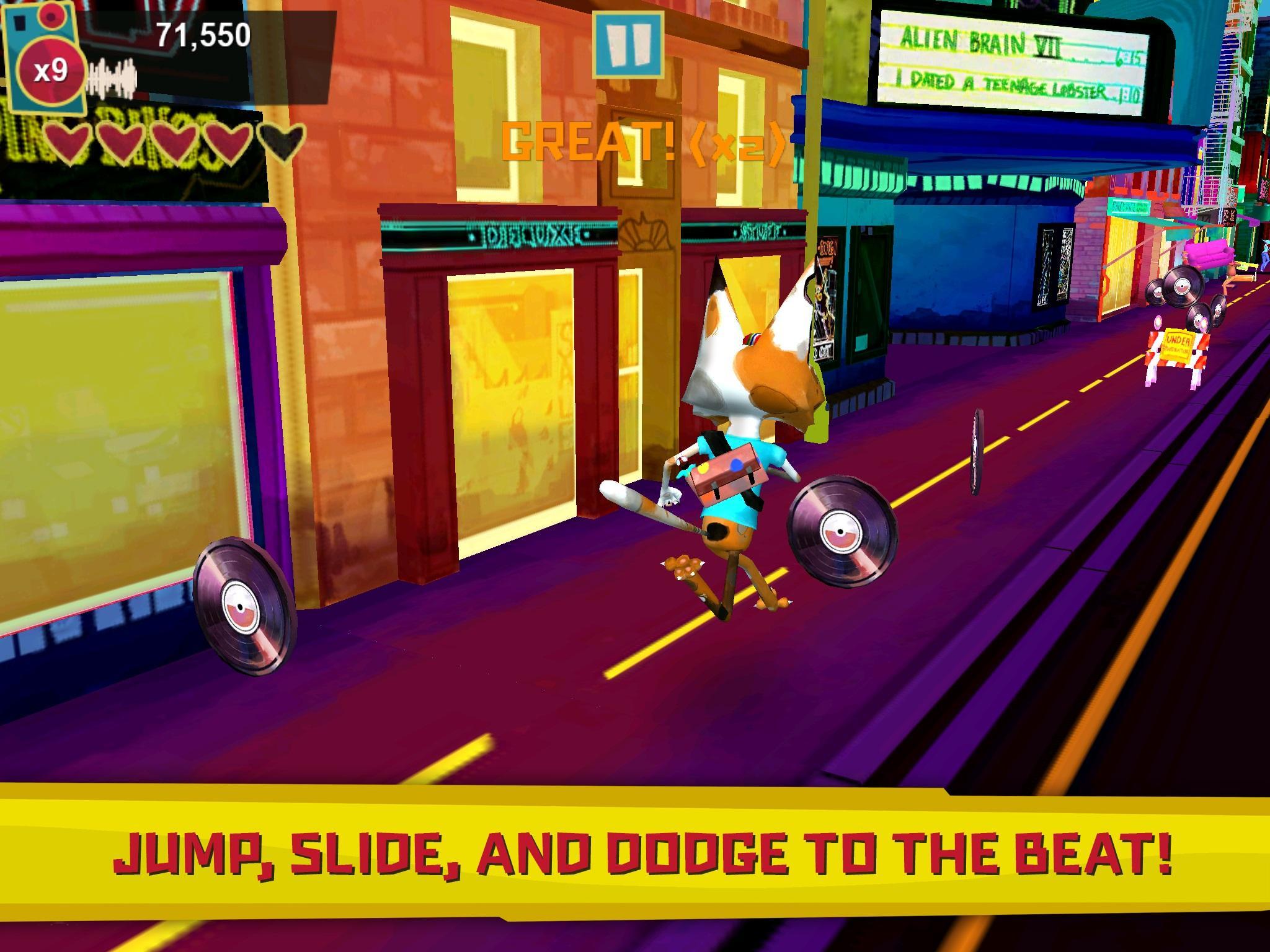 Record Run features an amazing hand-painted art style, characters with tons of personality, and moment-to-moment gameplay that’s deeply musical and crazy fun. Users select songs from the music library on their device and run through levels along with their music that are created on the spot by all new Harmonix magic. Unlock content and currency through a series of exciting “missions” that track your progress and transform the city into an amazing “Groove World".