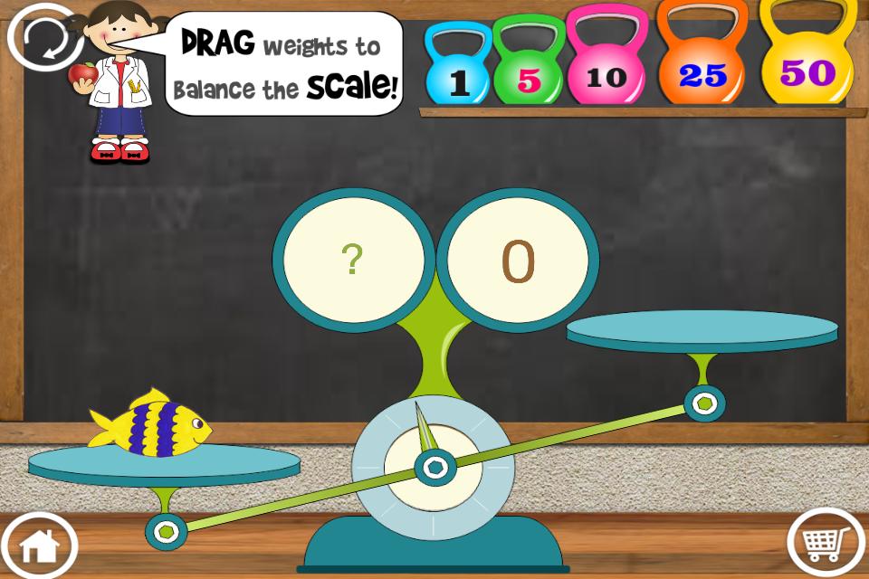 Угадайте, что режим веса представляет объект в масштабе вместе с различными весами. Затем вы можете перетаскивать веса и попытаться сбалансировать масштаб и определить вес объекта. В игре не используются фунты, унции, килограммы или граммы, но упрощает процесс взвешивания, чтобы сделать его доступным для молодых малышей. Он учит детей, как измерить вес объекта, позволяя им использовать разные цифры, чтобы общая сумма до взвешивания объекта. Это также поощряет математические навыки, поскольку они начнут видеть закономерности, используя веса 1,5,10,25 и 50 единиц (не LB или Kg, специфичные).