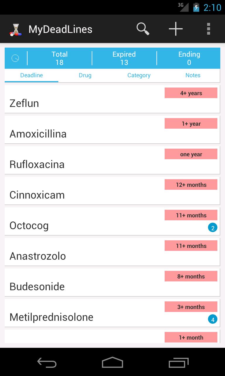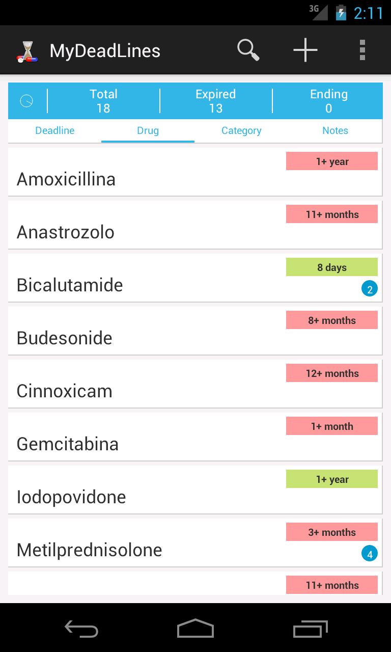 С помощью MyDeadlines каждый раз, когда вы покупаете лекарство, входит в приложение с истечением срока действия или после первого использования. Уведомления предупредят вас о крайнем сроке, так что вы можете выбросить истекший препарат и, возможно, снова купить.