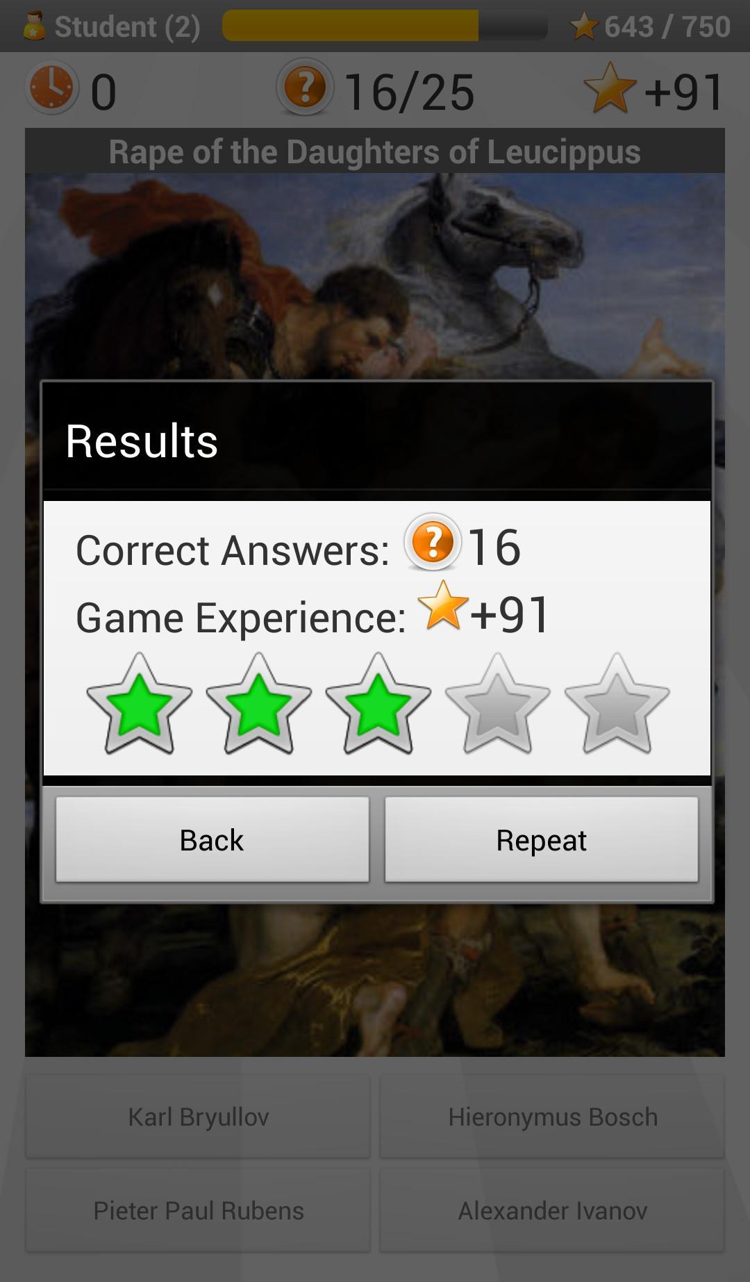 Check and improve your knowledge of famous paintings, enhances the experience and watch your progress. In the form of a game you will meet the great foreign and domestic artists, memorize their world-famous works, learn in which of the public galleries of the world they are represented.