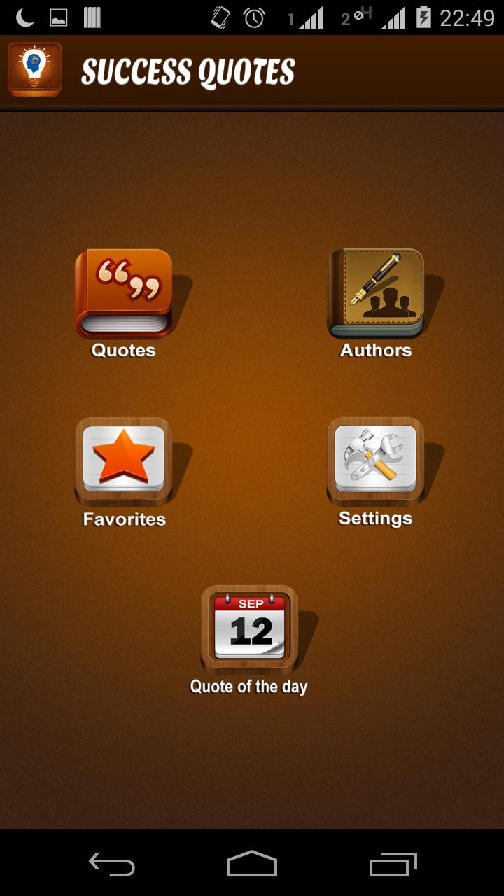Success Phrases 4 is an android application motivating you to hard work and to be enthusiastic to achieve your goals and make your dreams come true. It has 1000 success quotes for more than 180 authors. You are free to browse all of them directly by authors or you can receive a quote of the day every day at the time you specify . Also you can share any quote by different ways (sharing and sending to your friend by social network).